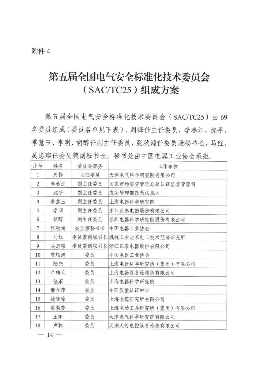 第五屆全國電氣安全標(biāo)準(zhǔn)化技術(shù)委員會(huì)(SAC/TC25)任期5年,由69名委員組成,秘書處由中國電器工業(yè)協(xié)會(huì)承擔(dān)。