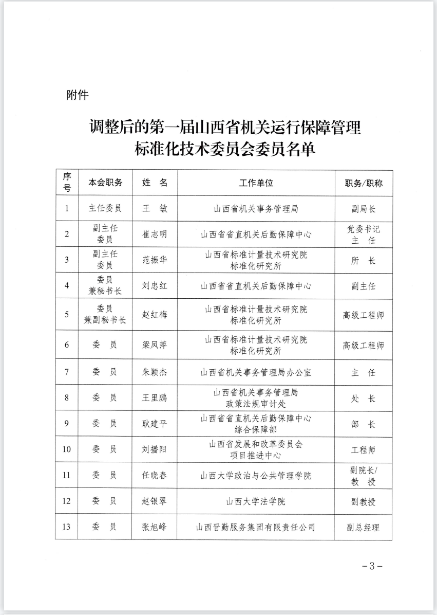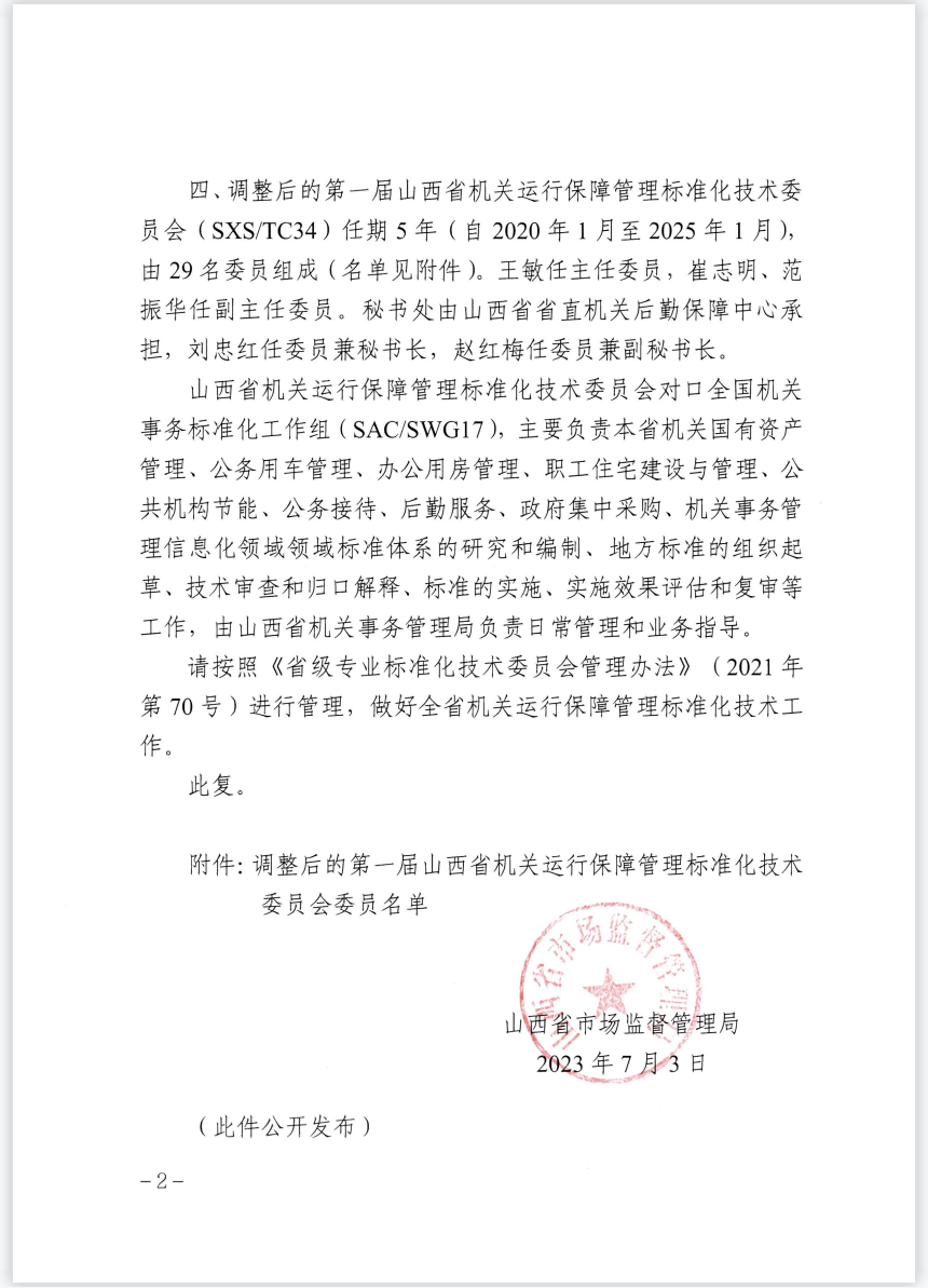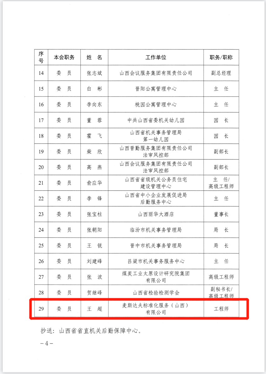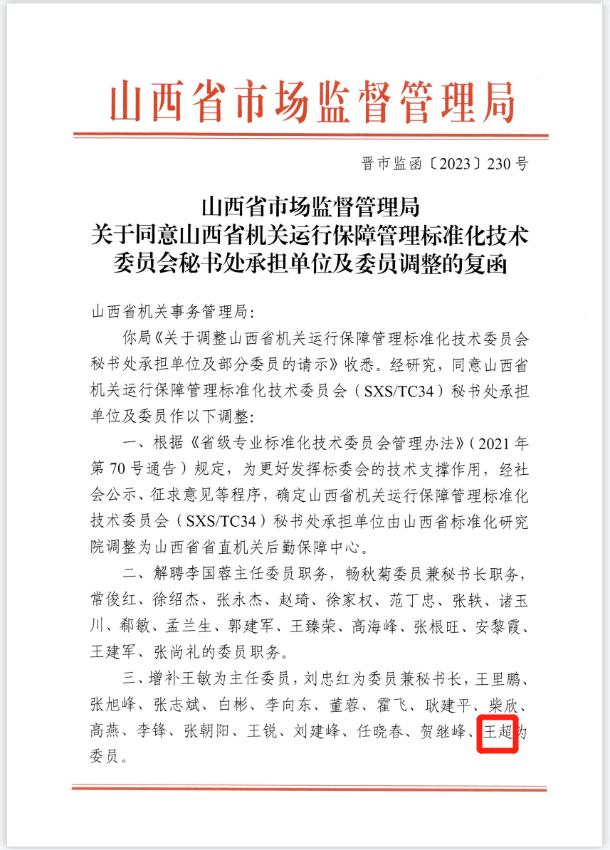 2023年7月3日,根據(jù)《山西省市場監(jiān)督管理局關(guān)于同意山西省機關(guān)運行保障管理標準化技術(shù)委員會秘書處承擔單位及委員調(diào)整的復函》,麥斯達夫標準化首席運營官王超當選山西省機關(guān)運行保障管理標準化技術(shù)委員會委員。