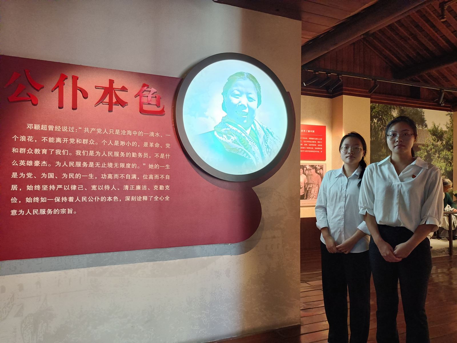 鄧穎超紀(jì)念館展廳由“邕城記憶、革命征程、婦女先驅(qū)、伉儷情深、公仆本色、情系廣西”6個單元組成,通過實物、圖片、場景復(fù)原、多媒體等多種方式全面展示了“南寧的女兒”鄧穎超同志波瀾壯闊的一生。邕城記憶展廳中展示了鄧穎超出生地附近的老照片以及鎮(zhèn)臺復(fù)原場景,介紹鄧穎超父親、母親,以及她在南寧的童年生活。革命征程展廳講述了鄧穎超同志艱苦奮斗的革命事跡。1919年,鄧穎超滿懷熱情地投身到了五四愛國運動當(dāng)中,與周恩來等人一同發(fā)起組織了天津進步青年團體——覺悟社。1924年鄧穎超在天津加入共青團,1925年轉(zhuǎn)為中共黨員,1934年跟隨大部隊從瑞金走到了陜北,憑著對革命事業(yè)的堅定信念和頑強的意志力走完了長征。在解放戰(zhàn)爭時期,鄧穎超以中共方面唯一女政協(xié)代表的身份出席舊政協(xié)會議,在重慶、南京、上海等地為爭取國內(nèi)和平積極奔走。