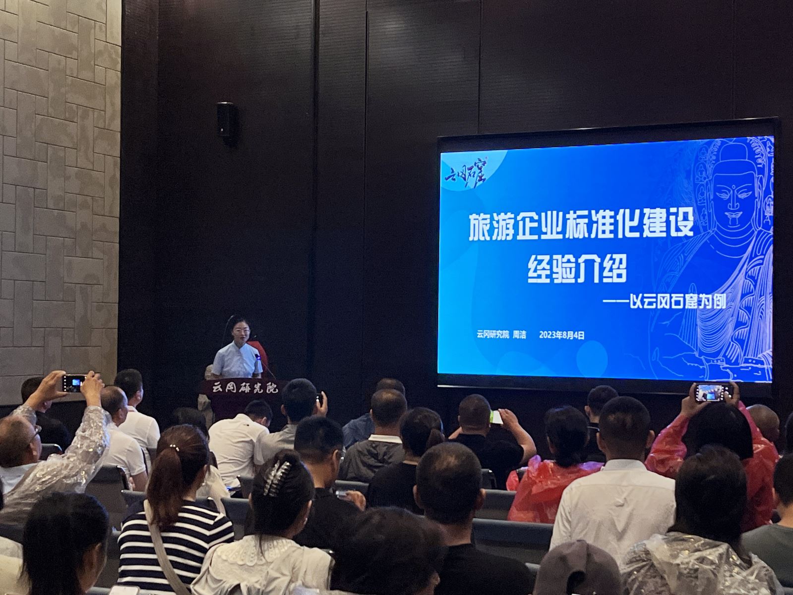 在培訓(xùn)班壓軸環(huán)節(jié),云岡研究院周潔以《旅游企業(yè)標(biāo)準(zhǔn)化建設(shè)經(jīng)驗(yàn)介紹——以云岡石窟為例》為題,系統(tǒng)介紹了云岡石窟景區(qū)旅游服務(wù)標(biāo)準(zhǔn)化建設(shè)的實(shí)施路徑、標(biāo)準(zhǔn)體系和創(chuàng)建成果,分享了標(biāo)準(zhǔn)化工作心得體會(huì),重點(diǎn)解讀了云岡研究院推動(dòng)旅游服務(wù)和文物保護(hù)融合發(fā)展的典型經(jīng)驗(yàn)。培訓(xùn)結(jié)束后,組織學(xué)員集體入園,現(xiàn)場(chǎng)觀摩了云岡研究院旅游服務(wù)標(biāo)準(zhǔn)化試點(diǎn)的建設(shè)成效。