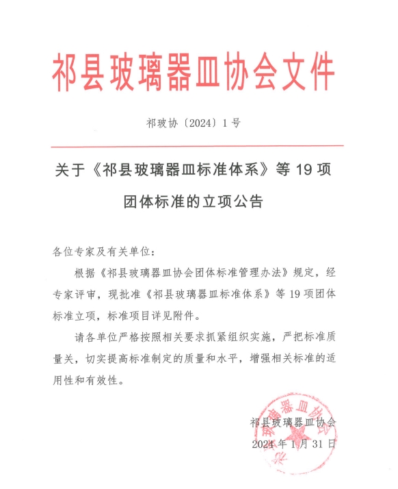 2024年1月31日,祁縣玻璃器皿協(xié)會發(fā)布關(guān)于《祁縣玻璃器皿標準體系》等19項團體標準的立項公告。