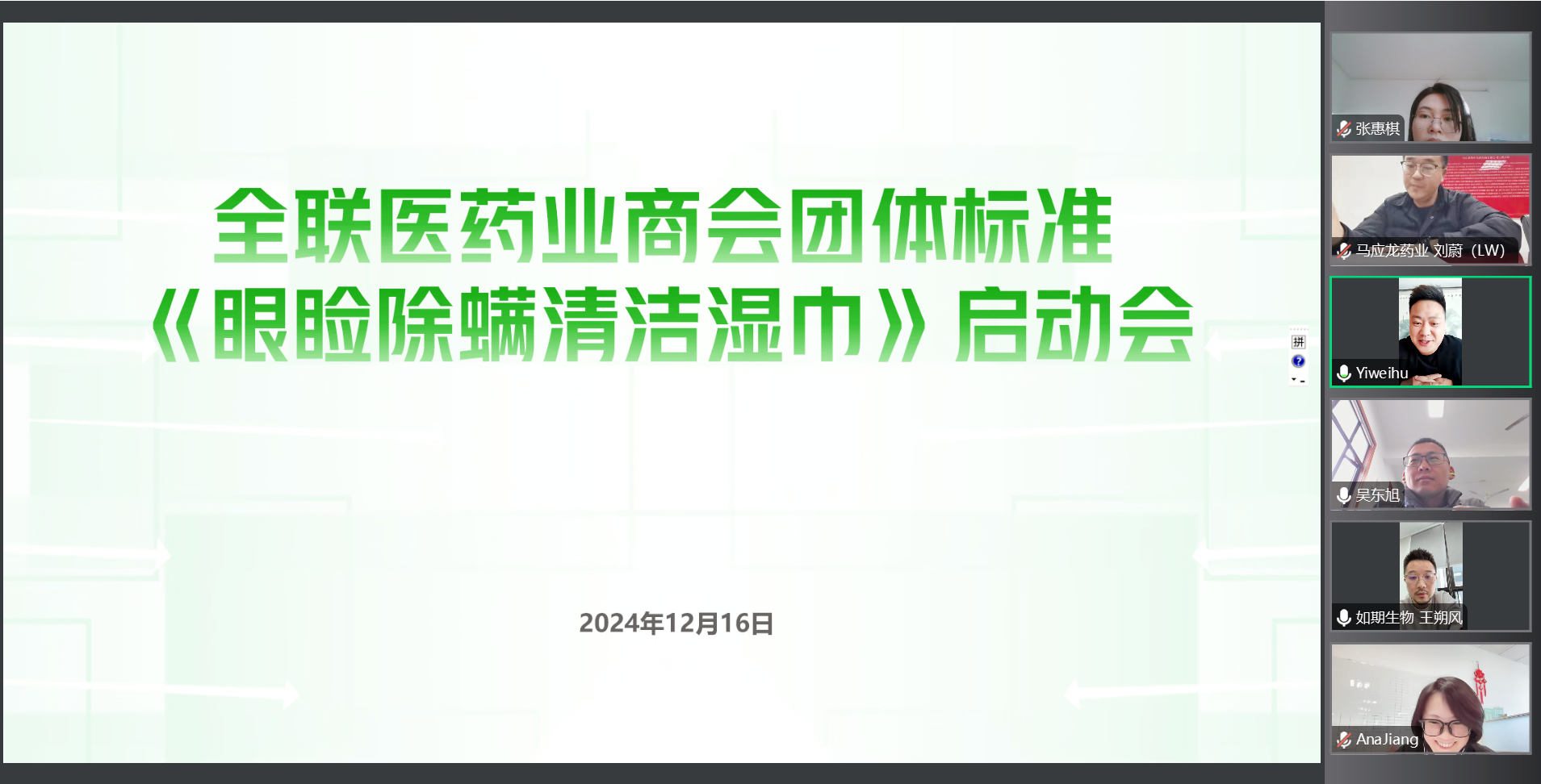 2024年12月16日,全聯(lián)醫(yī)藥業(yè)商會團(tuán)體標(biāo)準(zhǔn)《眼瞼除螨清潔濕巾》啟動會議以線上會議形式召開。泰州瞳衛(wèi)士眼健康科技有限公司、云南白藥集團(tuán)醫(yī)療科技合肥有限公司、馬應(yīng)龍藥業(yè)集團(tuán)股份有限公司、如期(深圳)生物科技有限公司、上海瞳光閃亮健康科技有限公司等標(biāo)準(zhǔn)起草組成員單位派員參會。會議由麥斯達(dá)夫標(biāo)準(zhǔn)化市場總監(jiān)、蘇州公司總經(jīng)理王釗柱主持。