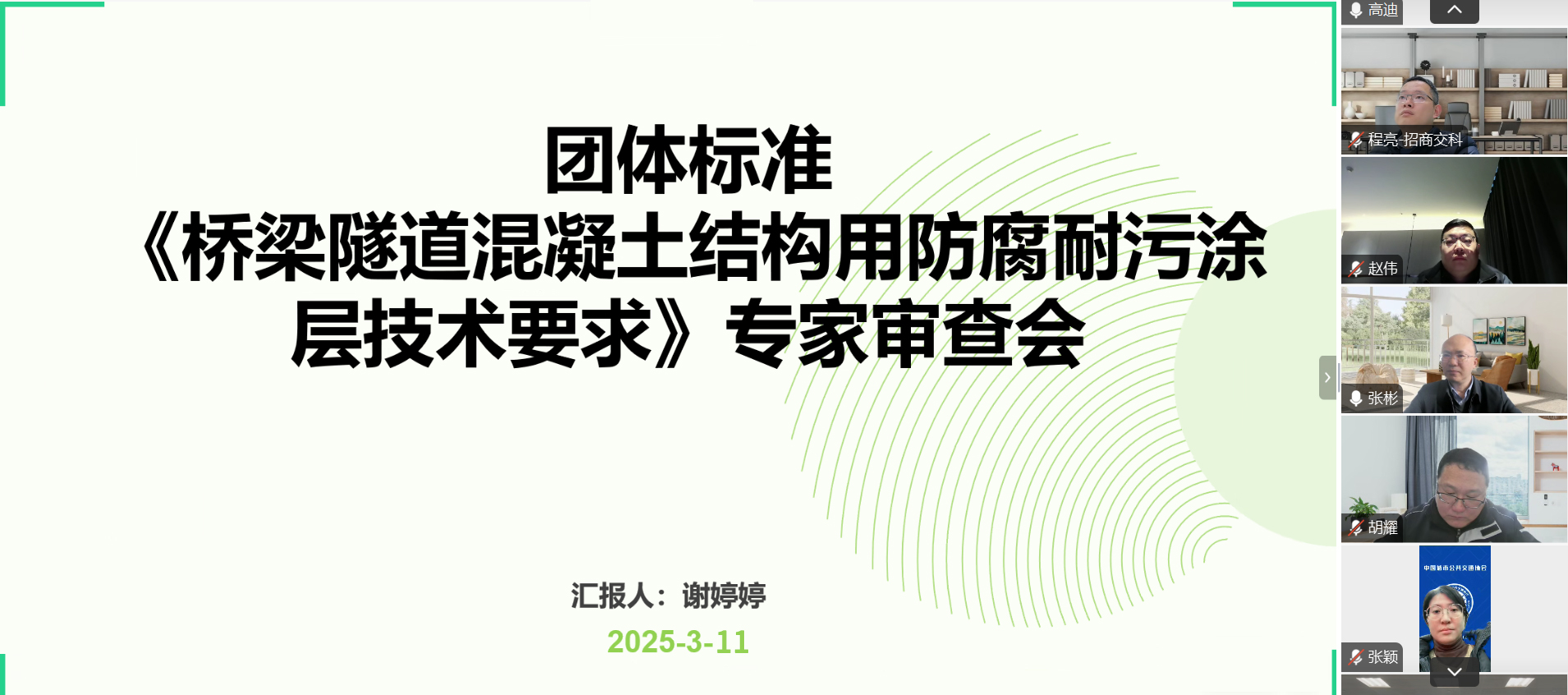 2025年3月11日,中國城市公共交通協(xié)會以線上會議形式組織召開團(tuán)體標(biāo)準(zhǔn)《橋梁隧道混凝土結(jié)構(gòu)用防腐耐污涂層技術(shù)要求》專家審查會。中國地質(zhì)大學(xué)(北京)、招商局重慶交通科研設(shè)計(jì)院有限公司、中國工程建設(shè)標(biāo)準(zhǔn)化協(xié)會、中鐵隧道集團(tuán)二處有限公司、中國城市公共交通協(xié)會的五名專家組成標(biāo)準(zhǔn)審查專家組。標(biāo)準(zhǔn)主編單位中宜硅材(蘇州)納米新材料科技有限公司總經(jīng)理陳海龍、技術(shù)經(jīng)理胡耀以及參編單位代表參加會議。會議由麥斯達(dá)夫標(biāo)準(zhǔn)化市場總監(jiān)、蘇州公司總經(jīng)理王釗柱主持。