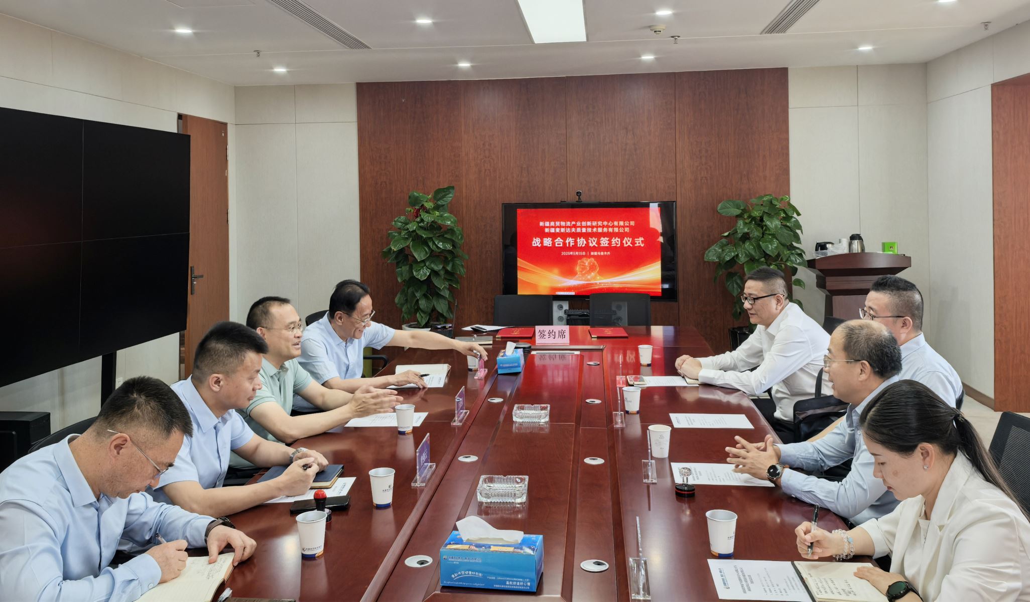 會(huì)上,首先雙方介紹各自參會(huì)人員,觀看了新疆商貿(mào)物流(集團(tuán))有限公司宣傳片。鄭波介紹了麥斯達(dá)夫的集團(tuán)概況、主營業(yè)務(wù)和服務(wù)案例。雙方圍繞標(biāo)準(zhǔn)化技術(shù)組織建設(shè)運(yùn)營、應(yīng)對(duì)綠色貿(mào)易壁壘、共建科研創(chuàng)新平臺(tái)等展開深入交流,達(dá)成共建長期穩(wěn)定合作關(guān)系的共識(shí)。曾強(qiáng)云、劉新宇分別代表新疆商貿(mào)物流產(chǎn)業(yè)創(chuàng)新研究中心有限公司和新疆麥斯達(dá)夫質(zhì)量技術(shù)服務(wù)有限公司簽訂戰(zhàn)略合作協(xié)議。