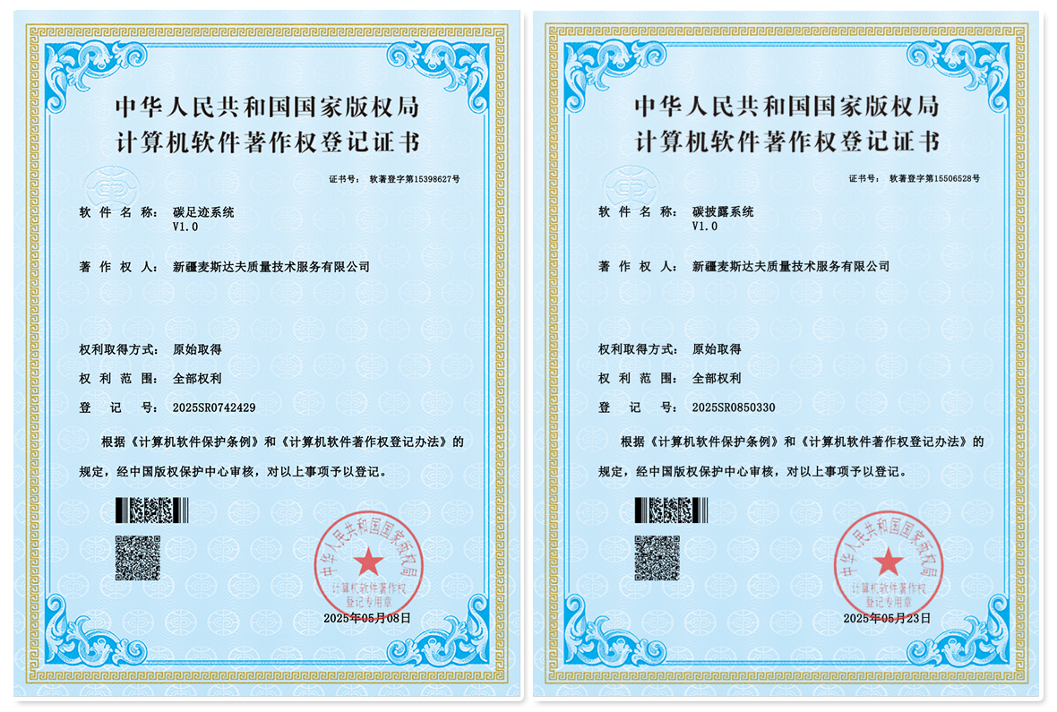 2025年4-5月,新疆麥斯達(dá)夫質(zhì)量技術(shù)服務(wù)有限公司先后獲批“碳監(jiān)測系統(tǒng)V1.0”“碳分析系統(tǒng)V1.0”“碳計量系統(tǒng)V1.0”“碳交易系統(tǒng)V1.0”“碳足跡系統(tǒng)V1.0”“碳披露系統(tǒng)V1.0”等六項(xiàng)雙碳領(lǐng)域軟件著作權(quán),實(shí)現(xiàn)雙碳技術(shù)服務(wù)全鏈條知識產(chǎn)權(quán)完整布局。