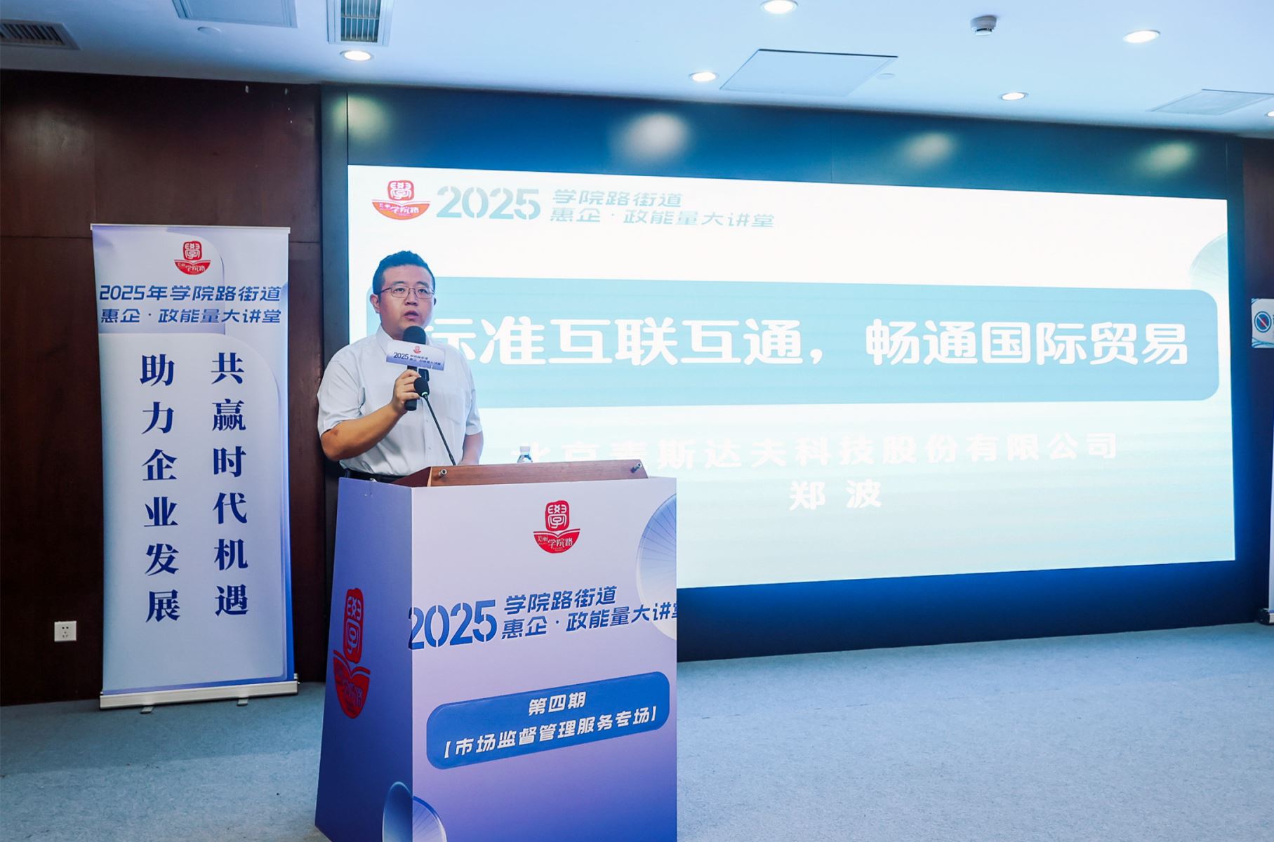 2025年9月18日,海淀區(qū)學院路街道“惠企·政能量大講堂”第四期活動——市場監(jiān)督管理服務專場在天工大廈舉辦。本次活動由海淀區(qū)市場監(jiān)督管理局指導,學院路街道黨工委、辦事處主辦,學院路街道市場監(jiān)督管理所、海淀區(qū)市場監(jiān)督管理局創(chuàng)新合伙人八家產業(yè)集群服務站協(xié)辦。麥斯達夫集團創(chuàng)始人、首席執(zhí)行官鄭波應邀出席,并作題為《標準互聯(lián)互通 暢通國際貿易》的主旨報告。