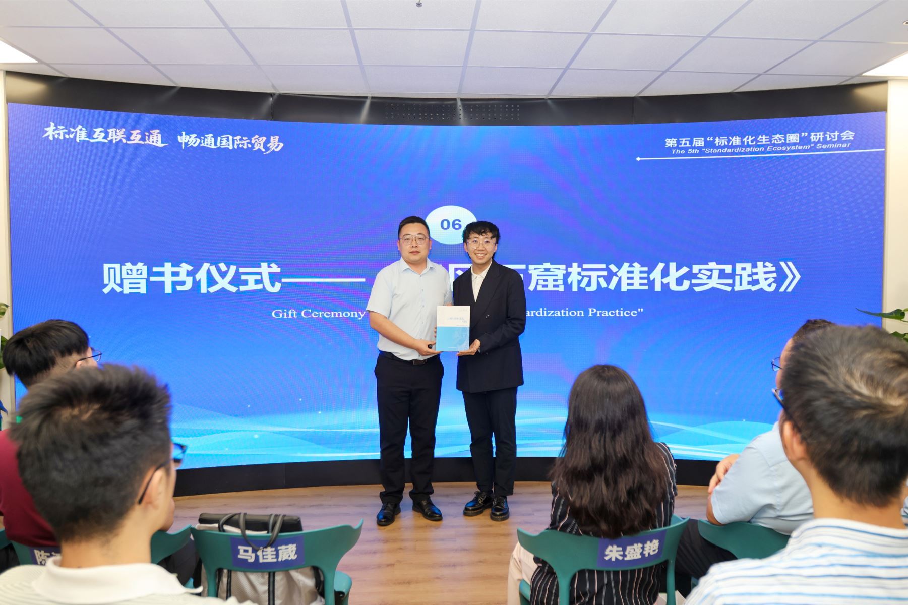 在成果發(fā)布環(huán)節(jié),麥斯達夫集團市場總監(jiān)王釗柱向山西籍馬佳葳教授贈送新書《云岡石窟標準化實踐》;鄭波進行了《產(chǎn)品標準化實戰(zhàn)》《標準互聯(lián)互通實務》兩本新書的預告。
