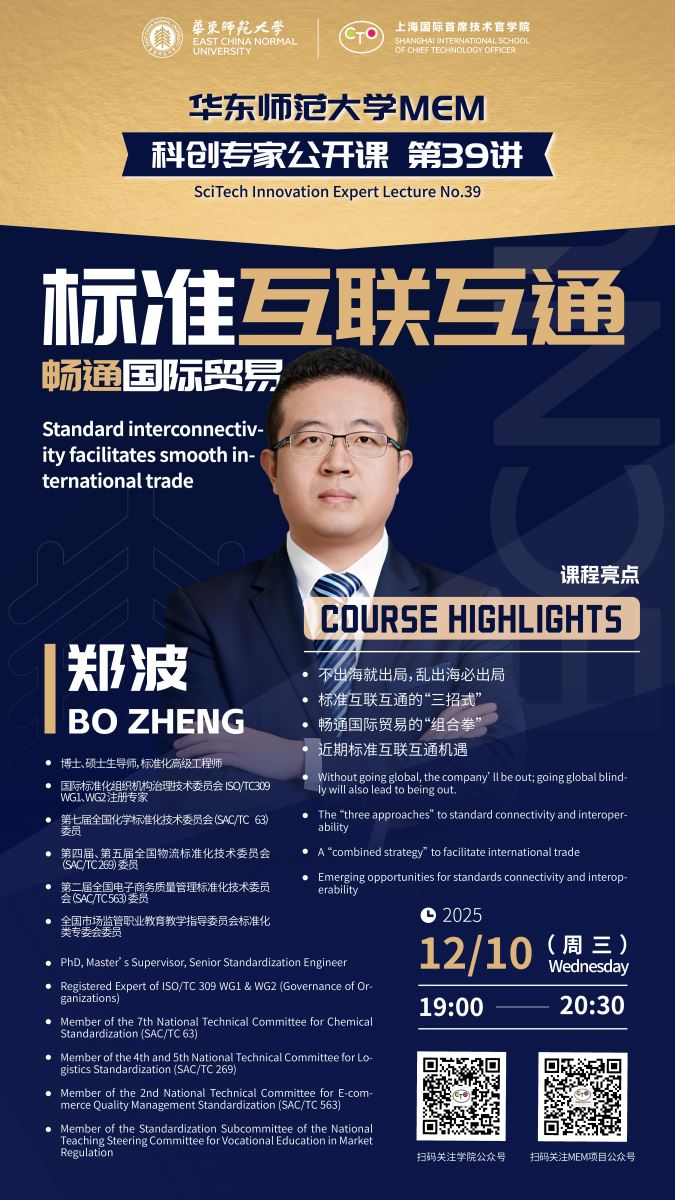 2025年12月10日,華東師范大學(xué)(上海國(guó)際首席技術(shù)官學(xué)院)成功舉辦科創(chuàng)專家公開課第39講。本次課程特邀麥斯達(dá)夫集團(tuán)創(chuàng)始人、首席執(zhí)行官鄭波,以《標(biāo)準(zhǔn)互聯(lián)互通 暢通國(guó)際貿(mào)易》為題,為MEM(工程管理碩士)新生及與會(huì)師生帶來一場(chǎng)緊扣時(shí)代脈搏的專題講座。