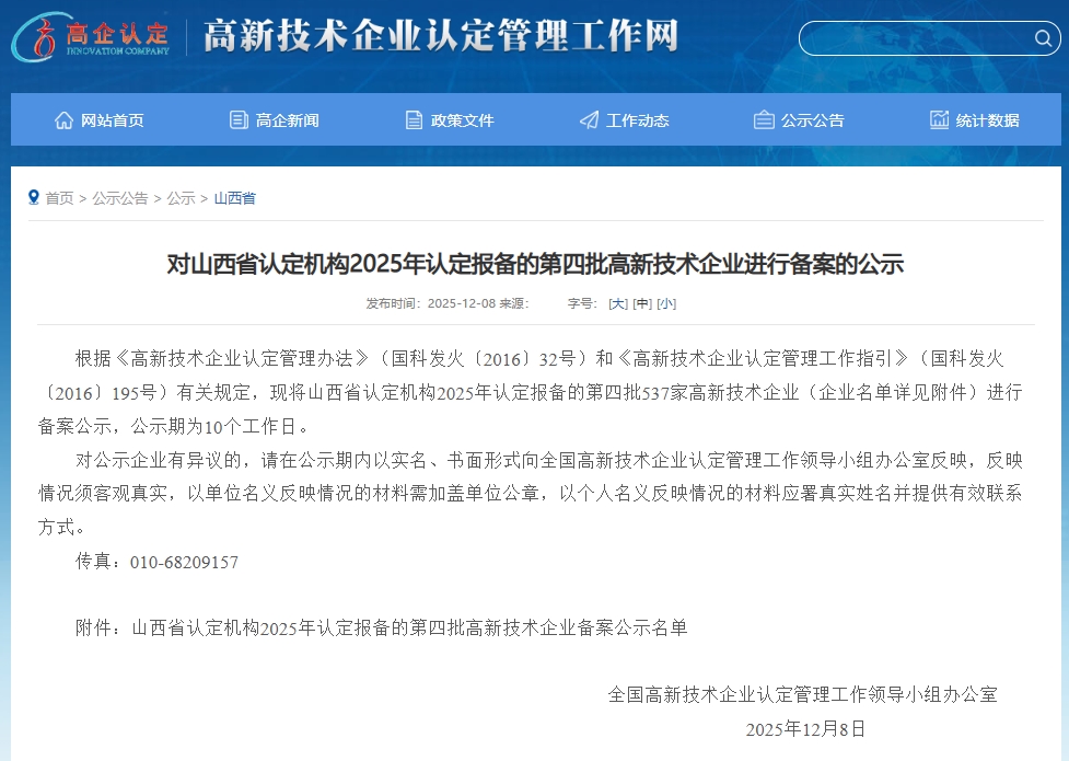 根據(jù)《高新技術(shù)企業(yè)認(rèn)定管理辦法》(國(guó)科發(fā)火〔2016〕32號(hào))和《高新技術(shù)企業(yè)認(rèn)定管理工作指引》(國(guó)科發(fā)火〔2016〕195號(hào))有關(guān)規(guī)定,山西省認(rèn)定機(jī)構(gòu)2025年認(rèn)定報(bào)備的第四批537家高新技術(shù)企業(yè)名單于2025年12月8日公示。麥斯達(dá)夫(山西)集團(tuán)有限公司榮耀位列其中,繼北京總部、深圳公司、廣州公司、天津公司之后,成為麥斯達(dá)夫集團(tuán)旗下第五家國(guó)家高新技術(shù)企業(yè)。