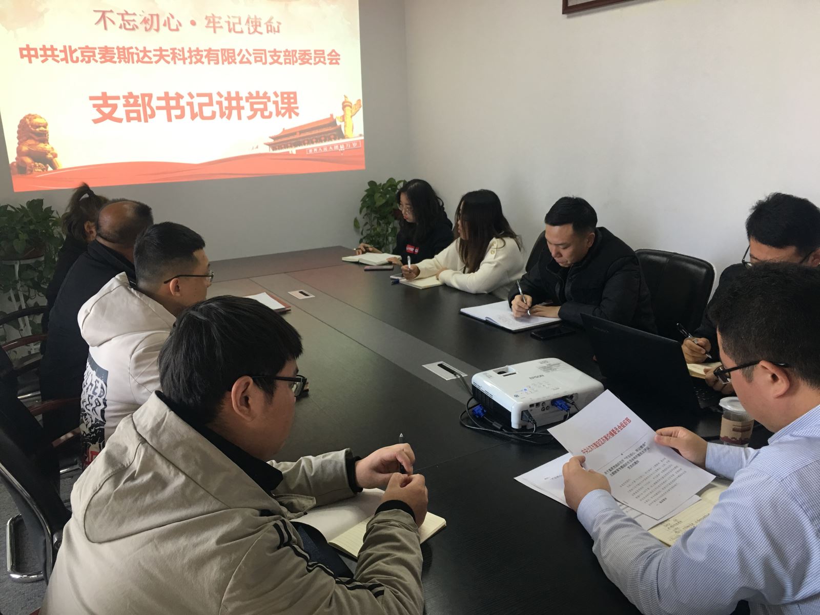 為進(jìn)一步深化“不忘初心、牢記使命”主題教育,集中傳達(dá)學(xué)習(xí)黨的十九屆四中全會(huì)精神,2019年12月2日,中共北京麥斯達(dá)夫科技有限公司支部委員會(huì)組織開(kāi)展“支部書(shū)記講黨課”活動(dòng)。