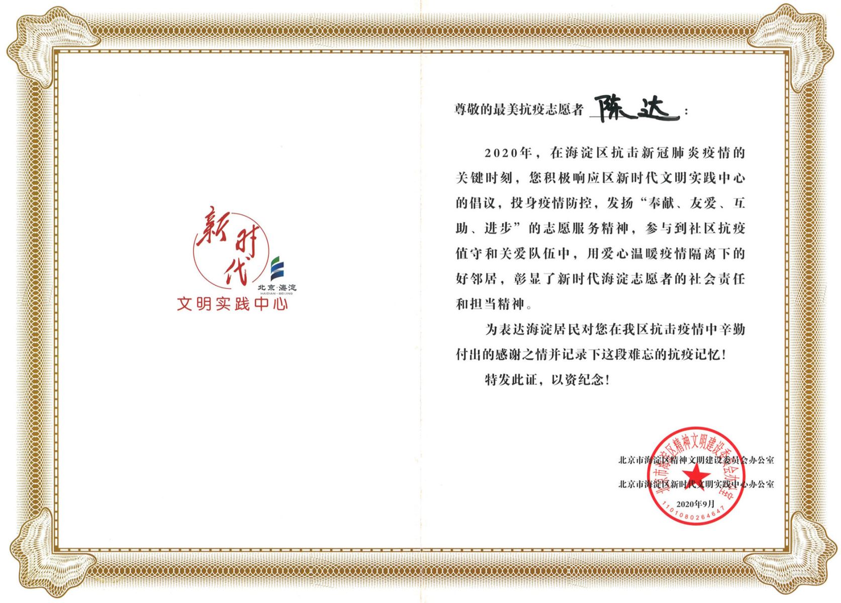 為深入貫徹習(xí)近平總書記關(guān)于堅(jiān)決打贏疫情防控阻擊戰(zhàn)的重要指示精神,進(jìn)一步關(guān)心激勵(lì)疫情防控人員,7月,海淀區(qū)新時(shí)代文明實(shí)踐中心開啟了第二批"最美抗疫志愿者"征集活動(dòng),經(jīng)過廣大人民群眾的推選點(diǎn)贊,共產(chǎn)生674位“最美抗疫志愿者”。麥斯達(dá)夫“標(biāo)兵共產(chǎn)黨員服務(wù)隊(duì)”隊(duì)員王超、謝小東、陳達(dá)獲評(píng)海淀區(qū)“最美抗疫志愿者”榮譽(yù)稱號(hào)。