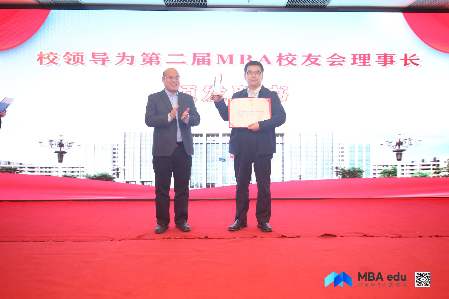 根據預備會議選舉投票,會議推舉經濟與管理學院院長、MBA教育中心主任李彥斌擔任第二屆MBA校友會理事長。黃向軍為新任理事長頒發(fā)聘書。