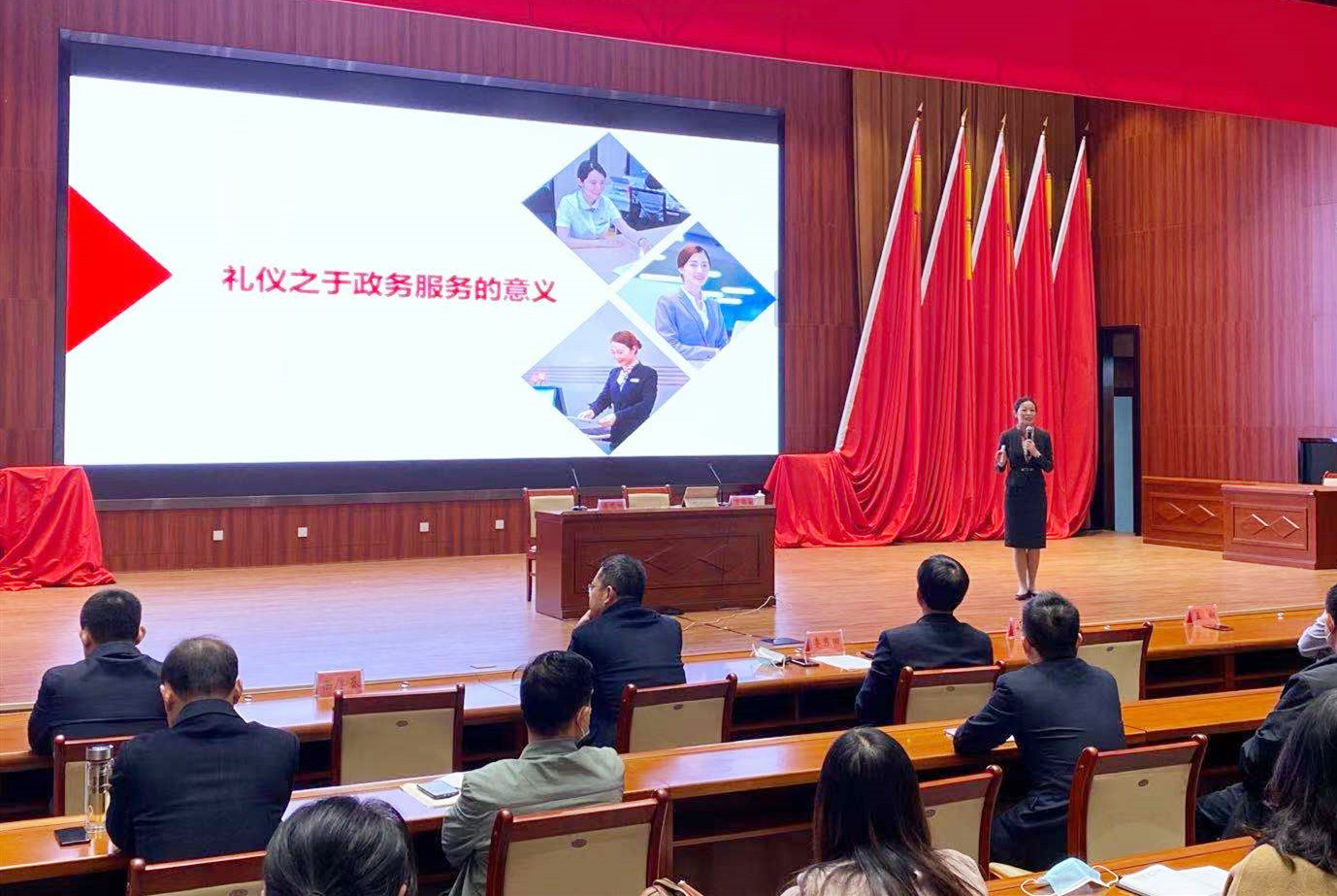 2020年11月22日,高密市政務(wù)服務(wù)禮儀培訓(xùn)大會在山東濰坊高密市政府大樓第一會議室召開。市行政審批服務(wù)局局長杜心東出席會議。市行政審批服務(wù)局黨組全體班子成員,各進(jìn)駐部門分管領(lǐng)導(dǎo)、首席代表,審批服務(wù)局全體工作人員,各進(jìn)駐部門窗口工作人員參加會議。會議由市行政審批服務(wù)局黨組副書記、副局長李秀田主持,麥斯達(dá)夫禮儀培訓(xùn)特聘專家肖奕安進(jìn)行授課。