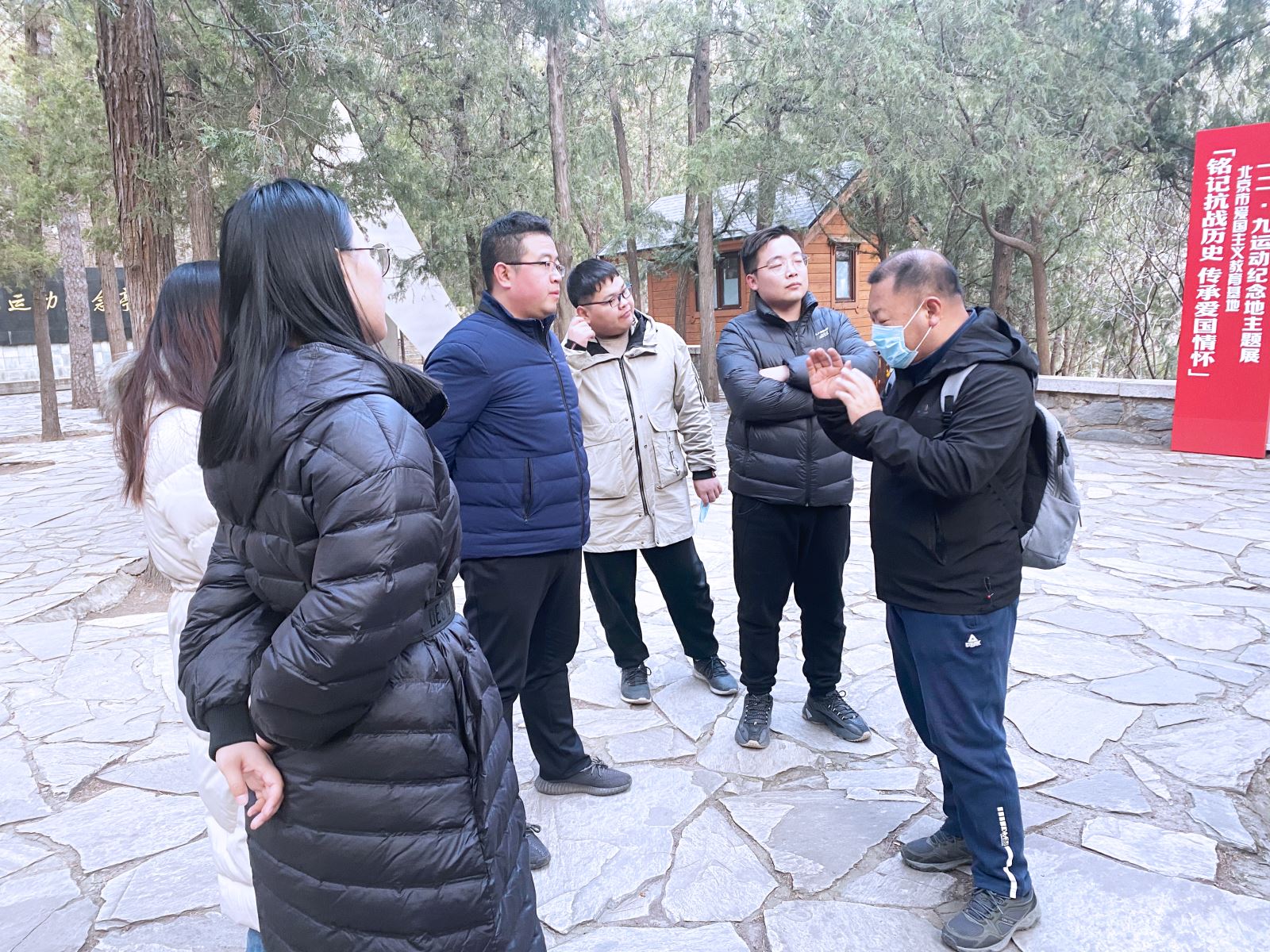 下午14時,全體人員抵達植物園后,大家熱情滿滿、興致勃勃以健步競賽方式徒步行至“一二·九”運動紀(jì)念亭。通過參觀現(xiàn)場展覽,大家進一步了解了“一二·九”運動的光輝歷史。1935年12月9日,在中國共產(chǎn)黨領(lǐng)導(dǎo)下,北平大中學(xué)生發(fā)起了“反對華北自治”、“反抗日本帝國主義”的抗日救亡運動。為紀(jì)念這一偉大運動,于1985年建成了“一二·九”運動紀(jì)念亭。紀(jì)念亭由3座三角形小亭組成一個立體的“眾”字,寓意廣大民眾的覺醒和眾志成城、抵抗侵略的決心;寓意革命傳統(tǒng)代代相傳,革命事業(yè)后繼有人。