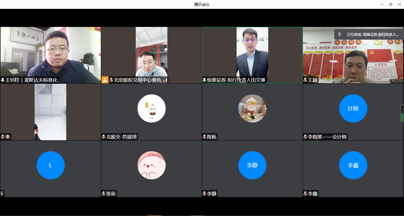 2021年1月19日,全國中小企業(yè)股份轉(zhuǎn)讓系統(tǒng)掛牌第一次輔導(dǎo)會以視頻會議形式召開。北京股權(quán)交易中心投資者與產(chǎn)品部負責人符展翊,恒泰長財證券、海潤天睿律師事務(wù)所、中興財光華會計事務(wù)所相關(guān)負責人員出席會議。麥斯達夫首席執(zhí)行官鄭波、首席運營官王超、市場總監(jiān)王釗柱參加會議。會議由北京股權(quán)交易中心投資者與產(chǎn)品部高級經(jīng)理秦偉主持。