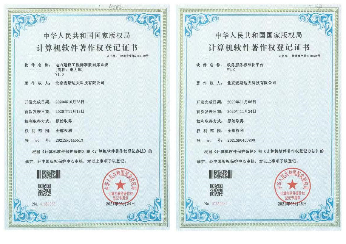 2021年4月8日,北京麥斯達(dá)夫科技有限公司獲得兩項(xiàng)軟件著作權(quán)證書,“電力建設(shè)工程標(biāo)準(zhǔn)數(shù)據(jù)庫系統(tǒng)”和“政務(wù)服務(wù)標(biāo)準(zhǔn)化平臺”。