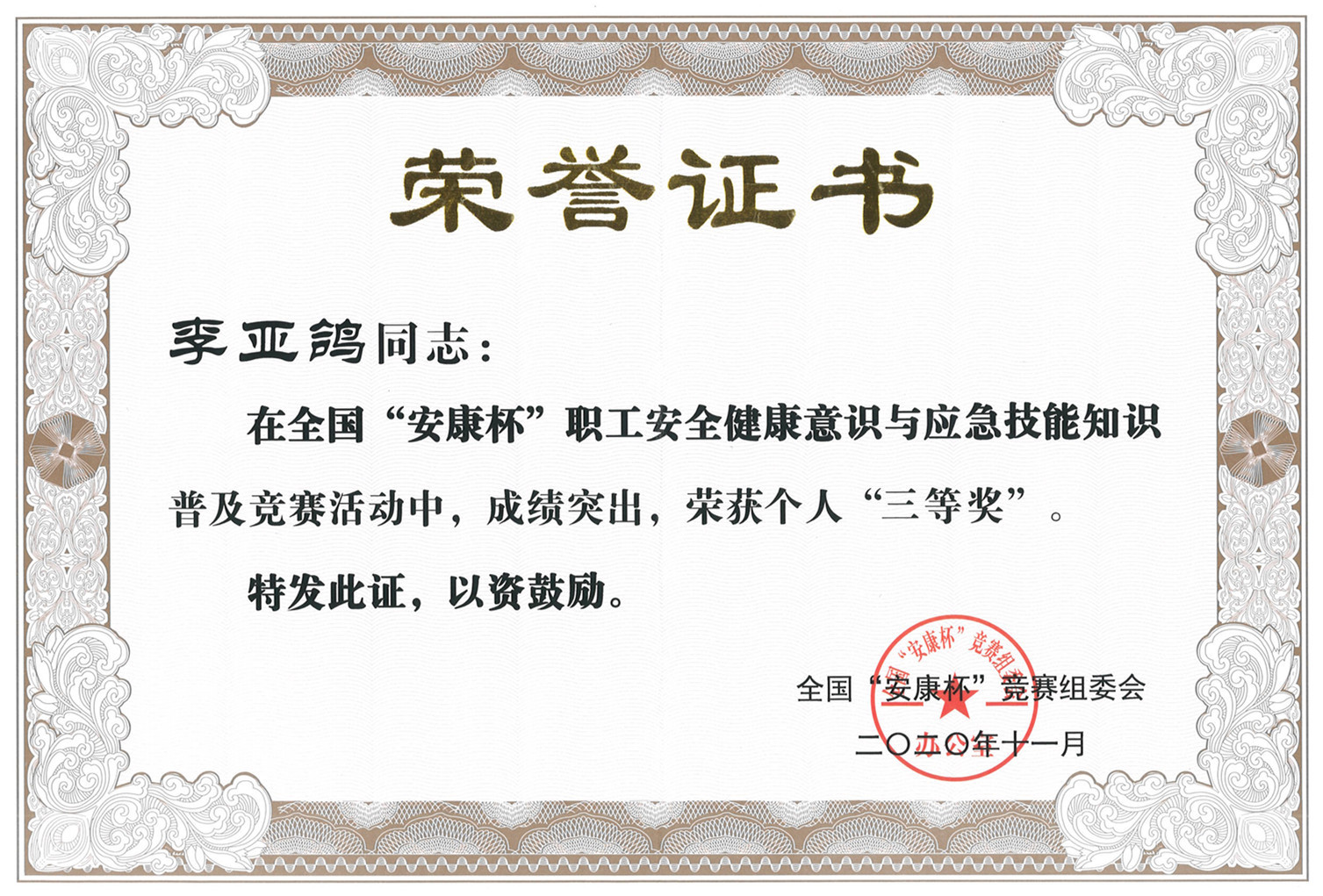 李亞鴿榮獲全國“安康杯”競賽三等獎