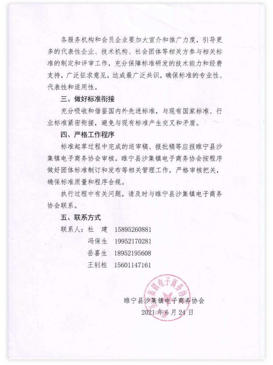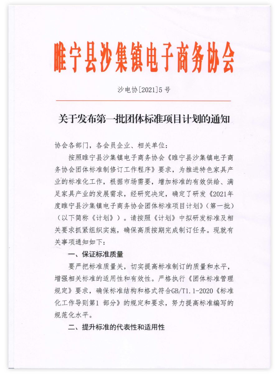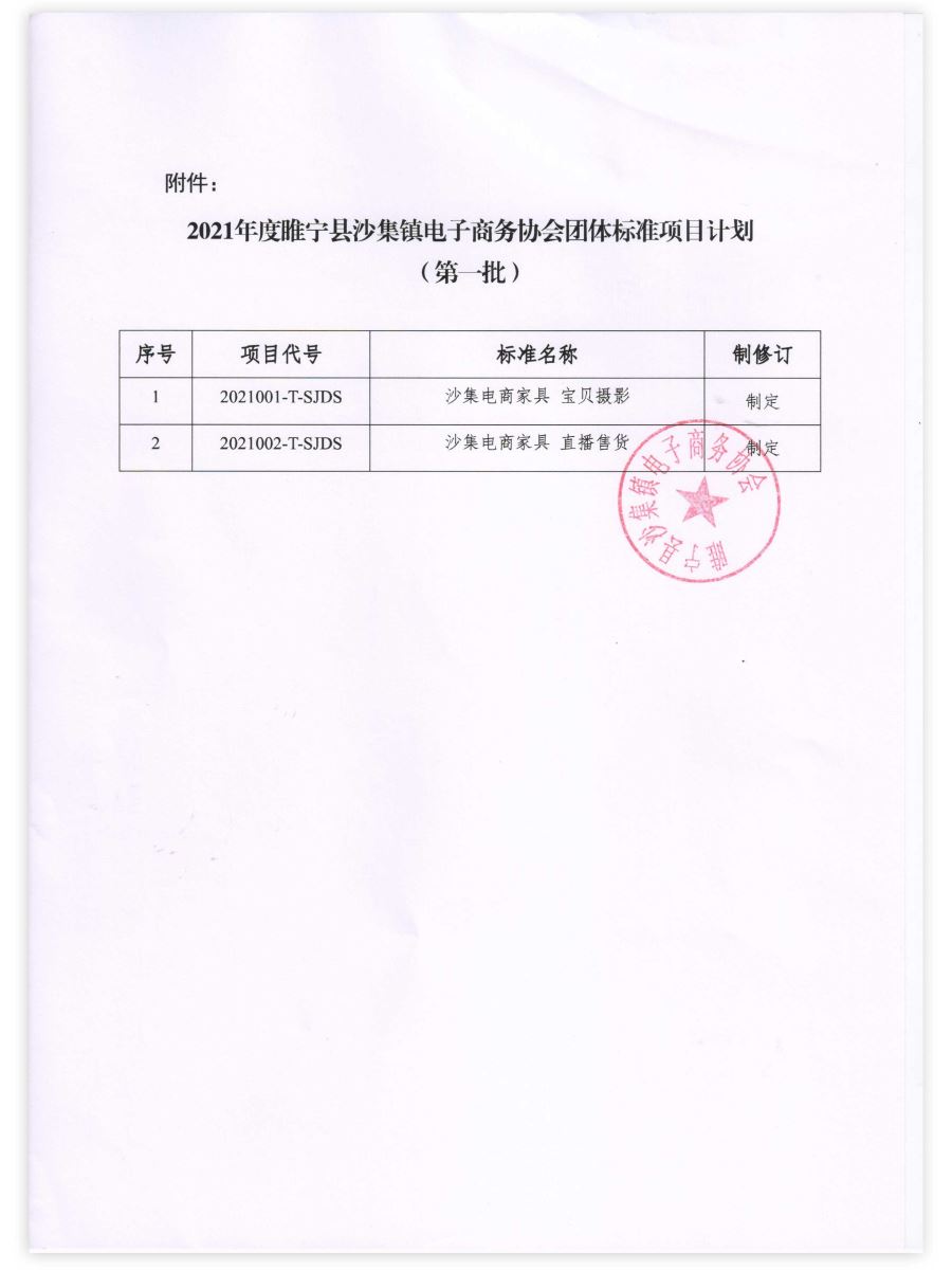 2021年6月24日,《沙集電商家具 寶貝攝影》《沙集電商家具 直播售貨》兩項(xiàng)團(tuán)體標(biāo)準(zhǔn)正式在睢寧縣沙集鎮(zhèn)電子商務(wù)協(xié)會(huì)立項(xiàng)。