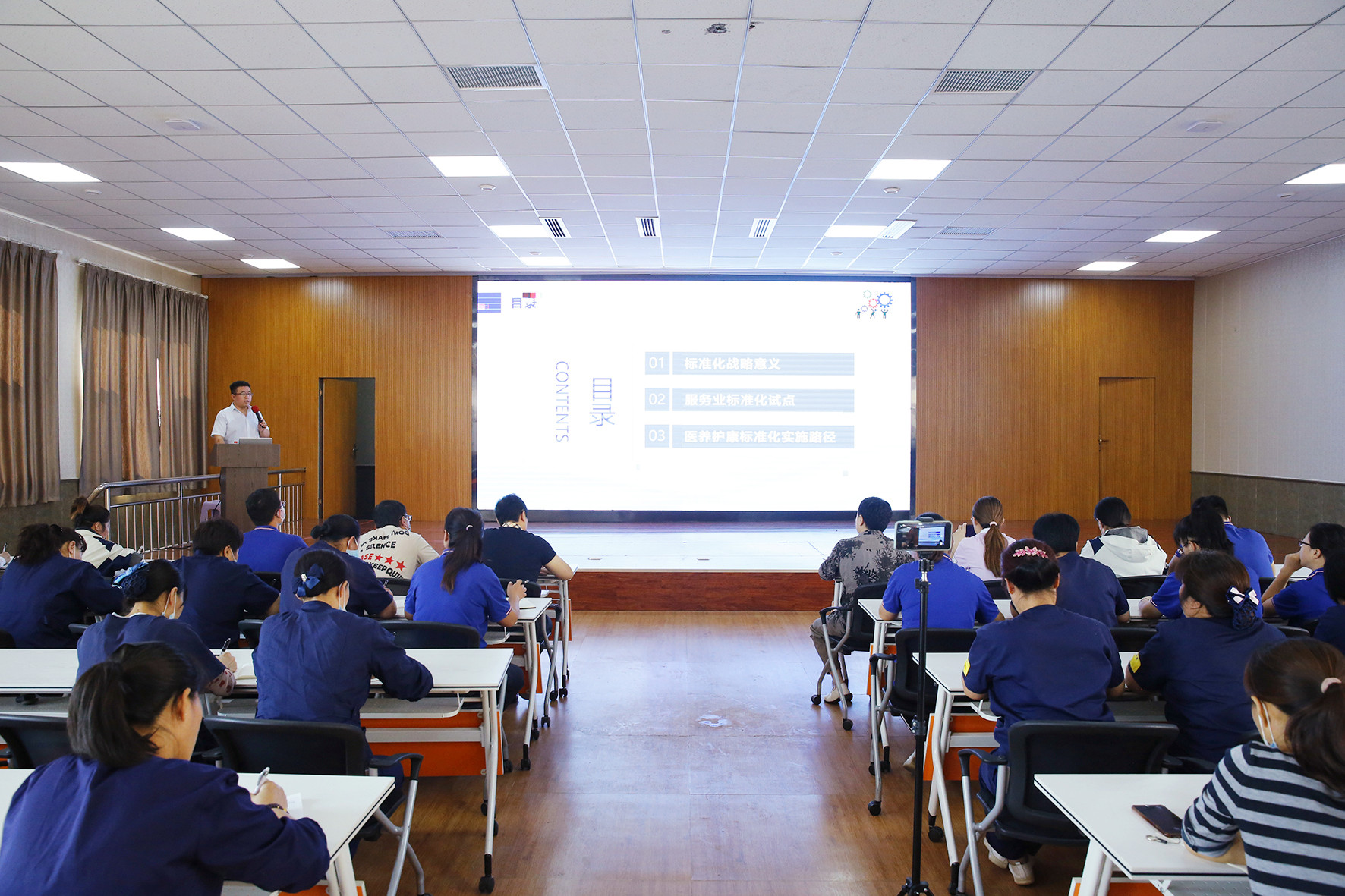 鄭波從標(biāo)準(zhǔn)化戰(zhàn)略意義、服務(wù)業(yè)標(biāo)準(zhǔn)化試點(diǎn)、醫(yī)養(yǎng)護(hù)康標(biāo)準(zhǔn)化實(shí)施路徑三個(gè)方面展開(kāi),為參與培訓(xùn)的員工講述了標(biāo)準(zhǔn)化戰(zhàn)略的重要性與美好愿景——只有掌握標(biāo)準(zhǔn),才能在市場(chǎng)競(jìng)爭(zhēng)中處于主導(dǎo)地位,才能促進(jìn)“醫(yī)、養(yǎng)、護(hù)、康”這一服務(wù)模式可持續(xù)健康快速推廣,從而為長(zhǎng)者提供具有普適性的生活環(huán)境與科學(xué)照護(hù)方案。講座結(jié)束后,還組織了隨堂測(cè)驗(yàn)和答案解析。