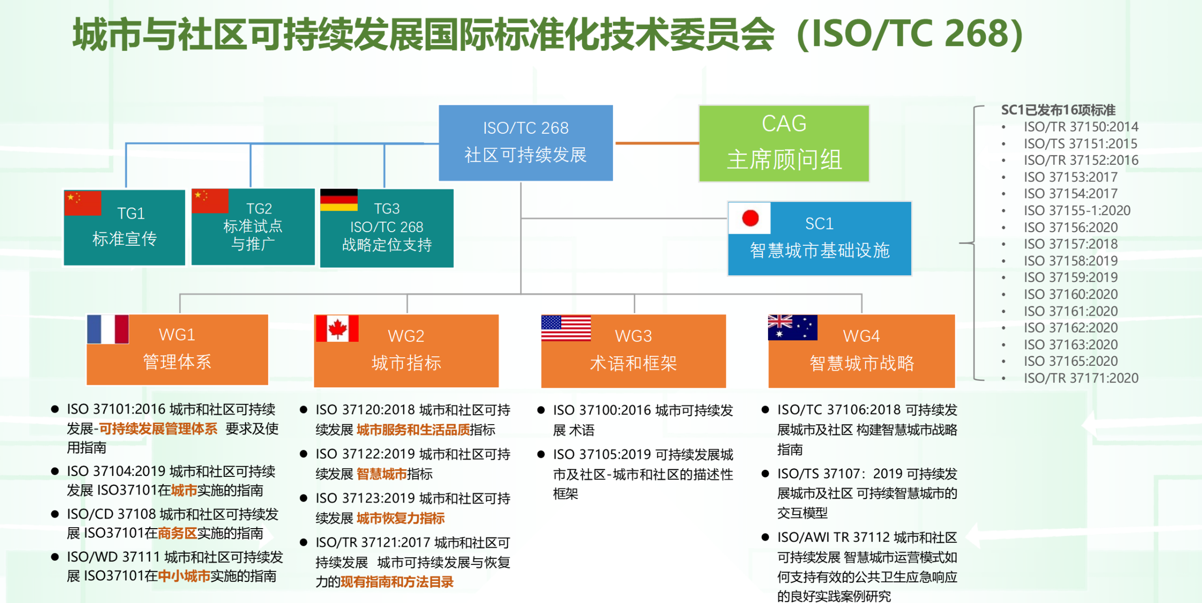 • 2016年7月,ISO/TC 268 發(fā)布ISO 37101《城市和社區(qū)可持續(xù)發(fā)展-可持續(xù)發(fā)展管理體系要求及使用指南》,這項(xiàng)標(biāo)準(zhǔn)是對(duì)各國(guó)城市可持續(xù)發(fā)展先進(jìn)經(jīng)驗(yàn)及理念的科學(xué)總結(jié),對(duì)城市的思維方式、工作方式、工作目標(biāo)和管理模式有重要的指導(dǎo)意義。