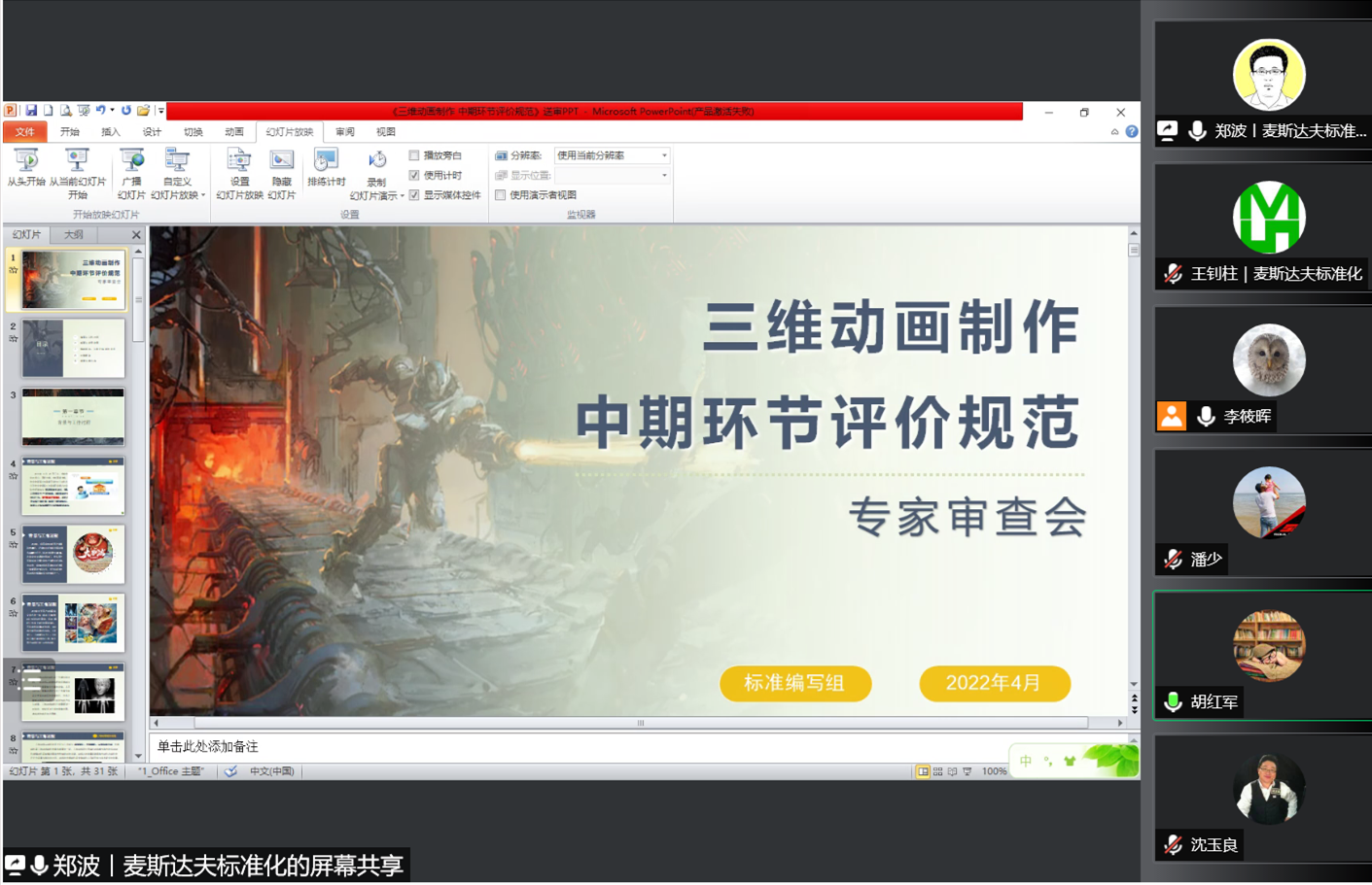 2022年4月14日,正值中國動(dòng)畫百年之際,文化行業(yè)標(biāo)準(zhǔn)《三維動(dòng)畫制作 中期環(huán)節(jié)評價(jià)規(guī)范》專家審查會以線上視頻會議形式召開。來自北京郵電大學(xué)、中國傳媒大學(xué)、中國標(biāo)準(zhǔn)化研究院、浙江中南卡通股份有限公司、全國動(dòng)漫游戲產(chǎn)業(yè)標(biāo)準(zhǔn)化技術(shù)委員會的五名專家組成標(biāo)準(zhǔn)評審專家組。標(biāo)準(zhǔn)起草組成員單位北京麥斯達(dá)夫科技股份有限公司首席執(zhí)行官鄭波,北京靈魂石數(shù)字科技有限公司總經(jīng)理?xiàng)罟鹈瘛⒏笨偨?jīng)理丁文、運(yùn)營總監(jiān)潘俊紹參加會議。會議由全國動(dòng)漫游戲產(chǎn)業(yè)標(biāo)準(zhǔn)化技術(shù)委員會秘書處李筱暉主持。