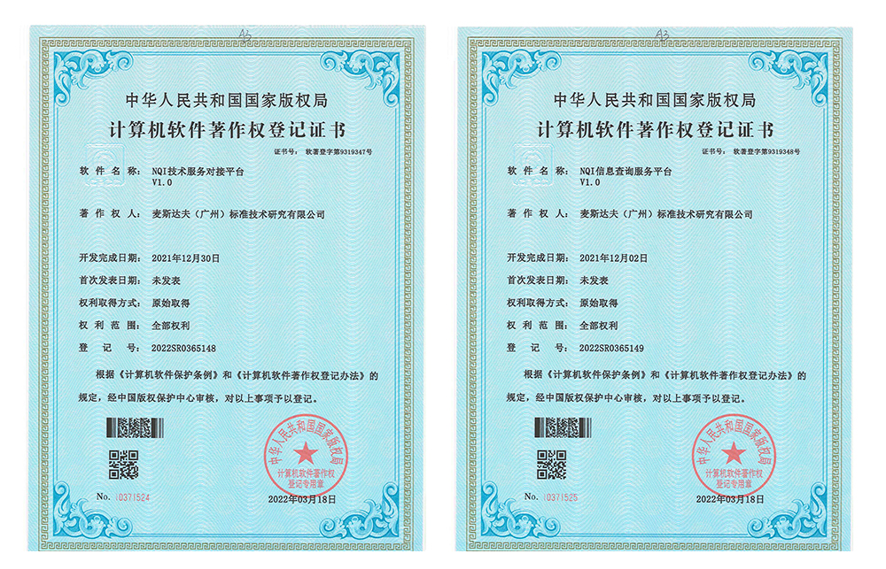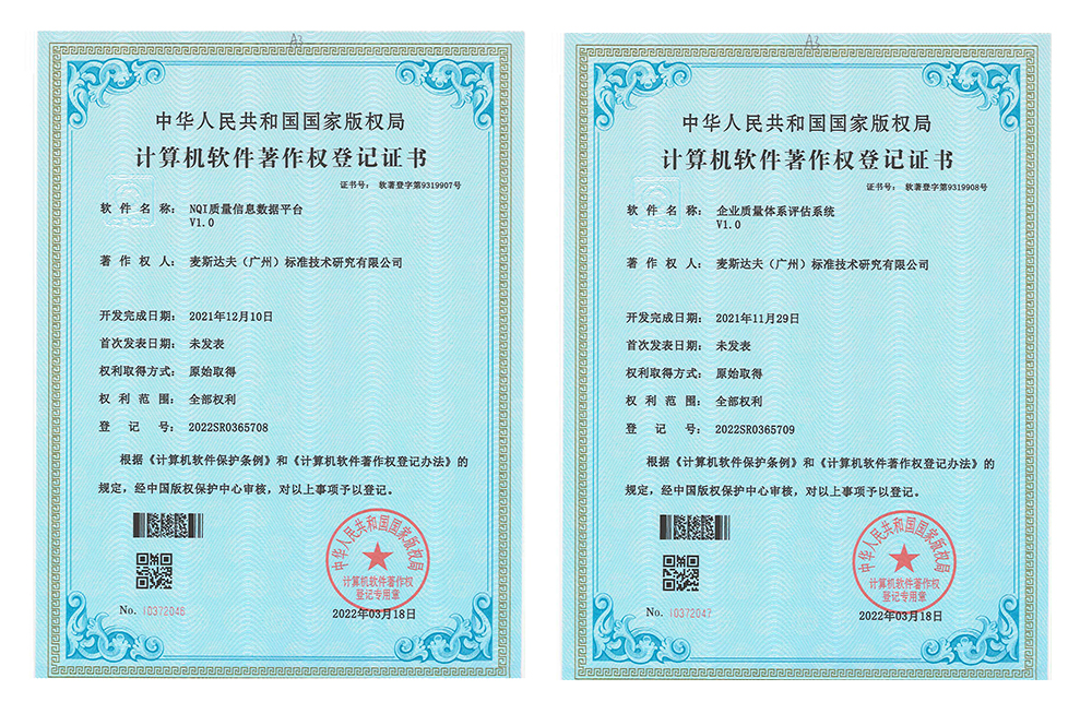 2022年4月18日,麥斯達(dá)夫(廣州)標(biāo)準(zhǔn)技術(shù)研究有限公司榮獲六項(xiàng)軟件著作權(quán)證書,“NQI服務(wù)機(jī)構(gòu)管理平臺(tái)”“NQI法律法規(guī)服務(wù)平臺(tái)”“NQI信息查詢服務(wù)平臺(tái)”“NQI技術(shù)服務(wù)對(duì)接平臺(tái)”“NQI質(zhì)量信息數(shù)據(jù)平臺(tái)”和“企業(yè)質(zhì)量體系評(píng)估系統(tǒng)”。