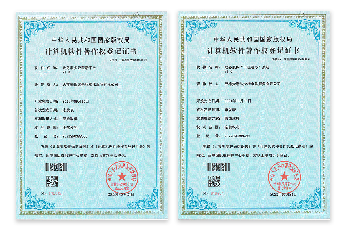 2022年5月16日,天津麥斯達(dá)夫標(biāo)準(zhǔn)化服務(wù)有限公司獲得兩項(xiàng)軟件著作權(quán)證書,“政務(wù)服務(wù)云踏勘平臺(tái)V1.0”“政務(wù)服務(wù)‘一證通辦’系統(tǒng)V1.0”。