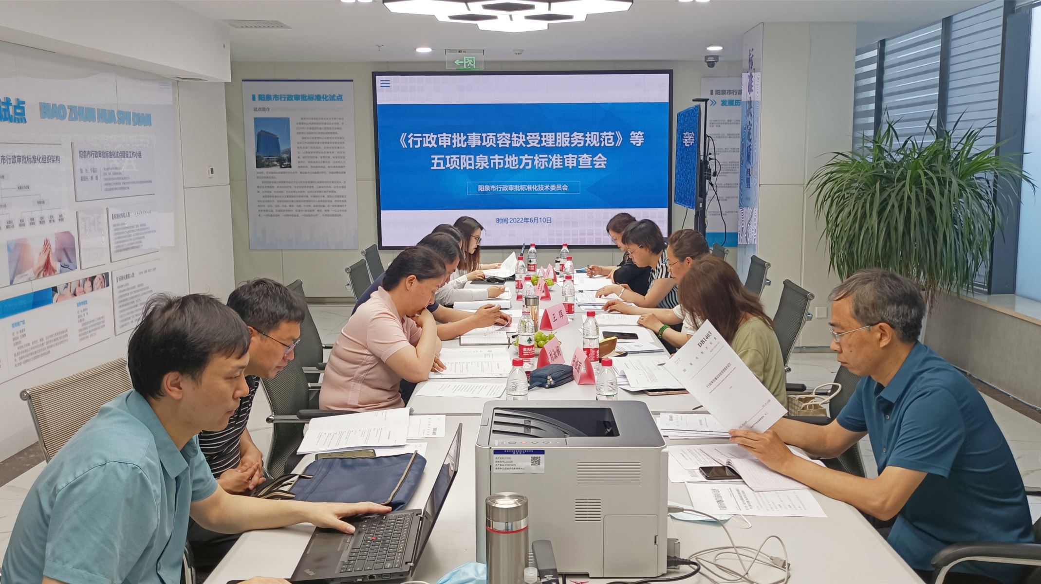 2022年6月10日,《行政審批事項(xiàng)容缺受理服務(wù)規(guī)范》等五項(xiàng)陽泉市地方標(biāo)準(zhǔn)審查會在市行政審批服務(wù)管理局標(biāo)準(zhǔn)化辦公室召開。來自陽泉市建筑設(shè)計(jì)院有限公司、平定縣行政審批服務(wù)管理局、郊區(qū)行政審批服務(wù)管理局、城區(qū)行政審批服務(wù)管理局、礦區(qū)行政審批服務(wù)管理局的五名專家組成標(biāo)準(zhǔn)審查專家組。陽泉市行政審批服務(wù)管理局黨組成員、副局長牛建東出席會議,標(biāo)準(zhǔn)起草組王超、張曼、王冬冬、周旭東參加會議。