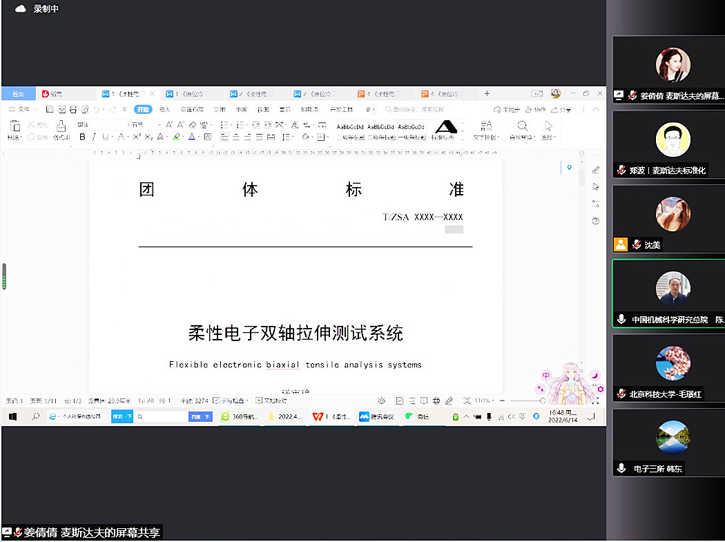 2022年6月14日,中關村標準化協(xié)會以線上會議形式召開中關村標準《柔性電子雙軸拉伸測試儀》《原位冷熱臺》專家審查會。來自中國機械科學研究總院、北京科技大學、中國電子科技集團公司第三研究所、北京市計量檢測科學研究院、賽迪集團等單位的專家組成標準評審專家組。標準主編單位北京中聚高科科技有限公司技術工程師張建亮參加會議并陳述答辯。