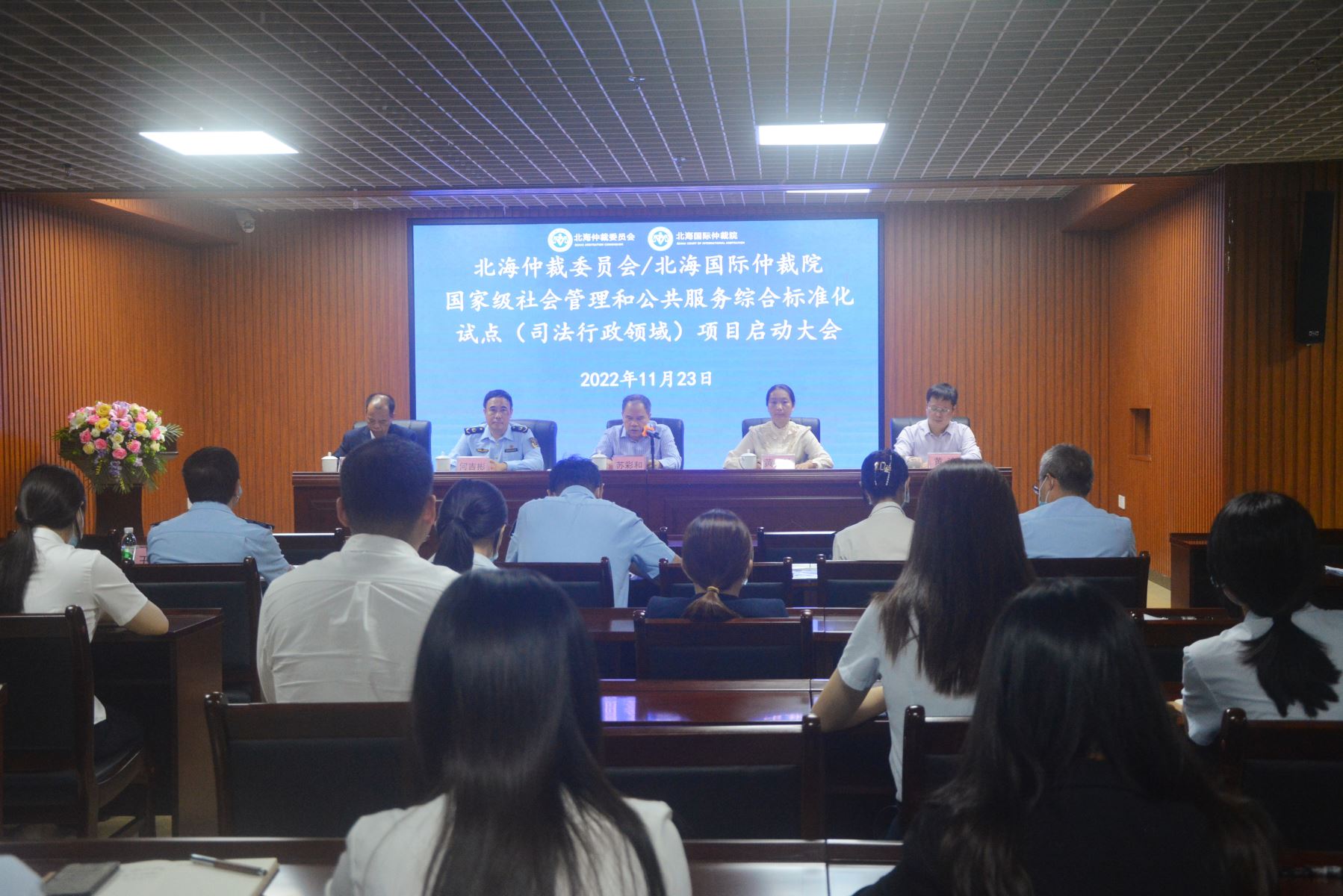 2022年11月23日,國家級社會管理和公共服務(wù)綜合標(biāo)準(zhǔn)化試點(司法行政領(lǐng)域)項目——“廣西北海仲裁法律服務(wù)標(biāo)準(zhǔn)化試點”啟動儀式在北海仲裁委員會二樓會議室舉行。廣西壯族自治區(qū)市場監(jiān)督管理局二級巡視員蘇彩和、標(biāo)準(zhǔn)化處副處長黃浪,北海市司法局黨組成員、副局長黃家玲,北海仲裁委員會主任鐘宏等人出席啟動儀式,北海仲裁委員會副主任朱際范、秘書長莫劍平及各科室負(fù)責(zé)人參加啟動儀式?;顒佑杀焙J惺袌霰O(jiān)督管理局黨組成員、總工程師何吉彬主持。