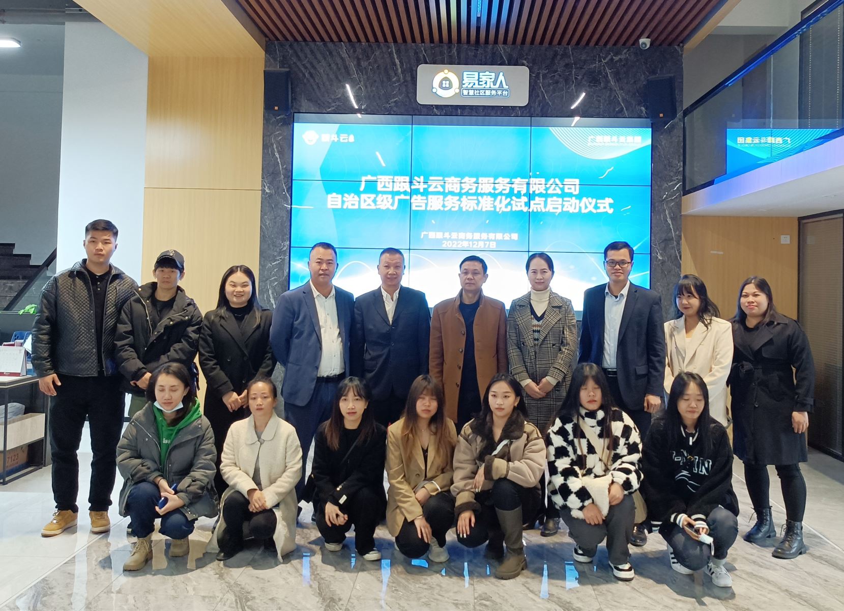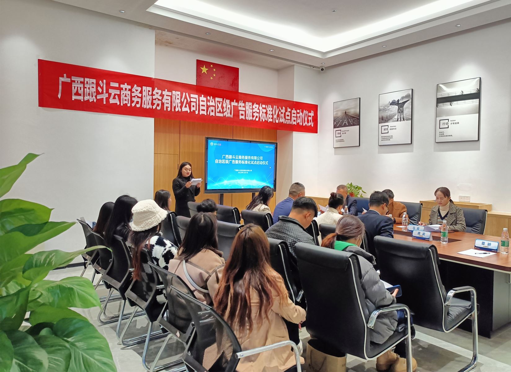 2022年12月7日,廣西壯族自治區(qū)級標準化試點項目——廣西跟斗云商務服務有限公司廣告服務標準化試點啟動儀式在廣西跟斗云商務服務有限公司會議室召開。南寧市市場監(jiān)督管理局四級調(diào)研員臧偉洲、標準化科科長馬霞,青秀區(qū)市場監(jiān)督管理局副局長劉成偉,廣西跟斗云商務服務有限公司總經(jīng)理遲玉成,跟斗云集團事業(yè)二部負責人黃婭婕,工廠運營總監(jiān)廖煒瑩等人出席會議。跟斗云集團其他有關(guān)部門及門店負責人參加會議。會議由廣西跟斗云商務服務有限公司人事主管覃嬌主持。