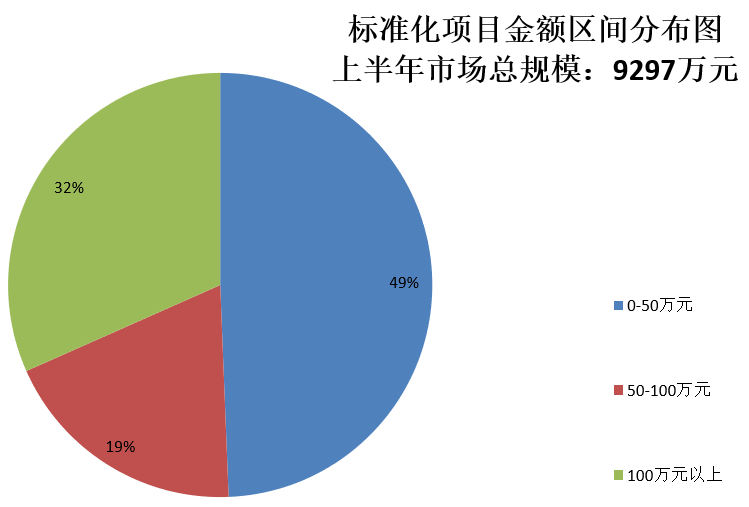 從表3、圖3可見,2018年1-6月,麥斯達(dá)夫統(tǒng)計(jì)的標(biāo)準(zhǔn)化服務(wù)業(yè)市場(chǎng)總規(guī)模為9297萬元,其中項(xiàng)目金額處于0-50萬元區(qū)間的項(xiàng)目最多,共計(jì)39個(gè),占項(xiàng)目總數(shù)的49.4%。