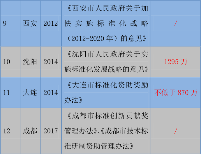 近年來,各省市為加快推進標準化建設,推動標準化戰(zhàn)略的實施,相繼出臺了標準化政策文件,深入推進標準化工作的開展;根據(jù)各省市公布的標準化戰(zhàn)略實施文件,我們梳理了近期關于標準化建設的資助政策,供各位學習參閱: