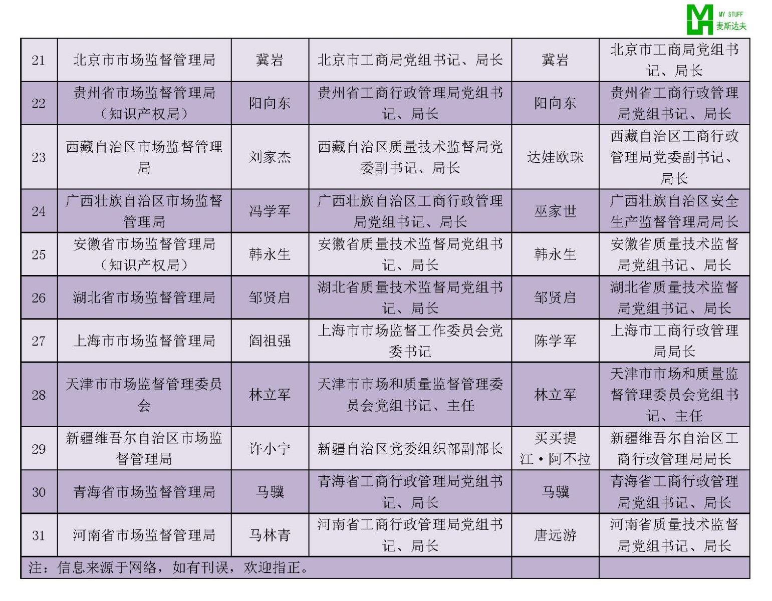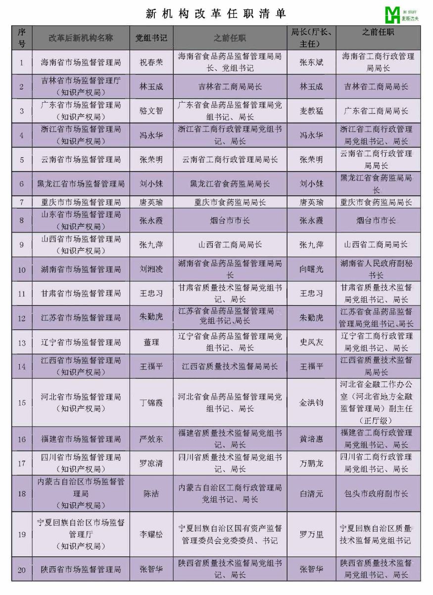 對于各省級市場機(jī)構(gòu)改革后名稱、掛牌時間、加掛情況、以及機(jī)構(gòu)負(fù)責(zé)人等做了詳細(xì)梳理,供大家參閱。