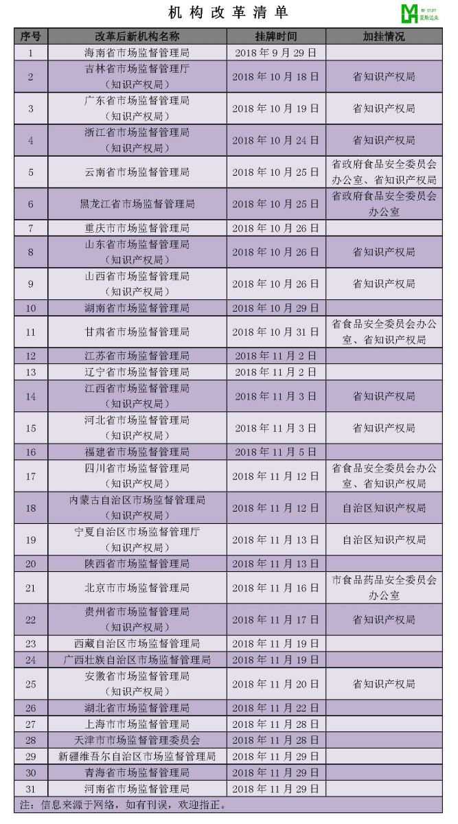 省級市場監(jiān)管機(jī)構(gòu)改革自2018年9月29日海南省市場監(jiān)督管理局掛牌伊始,到2018年11月29日,新疆、青海、河南市場監(jiān)督管理局相繼掛牌結(jié)束,歷時三個月的市場監(jiān)管機(jī)構(gòu)改革落下帷幕,31個省級市場監(jiān)管機(jī)構(gòu)均已掛牌成立。