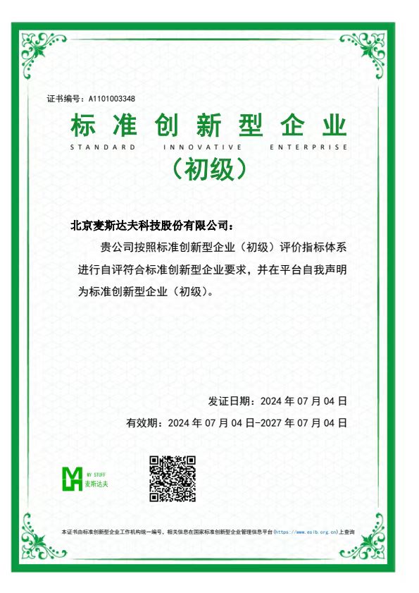 北京麥斯達(dá)夫科技股份有限公司獲評標(biāo)準(zhǔn)創(chuàng)新型企業(yè)