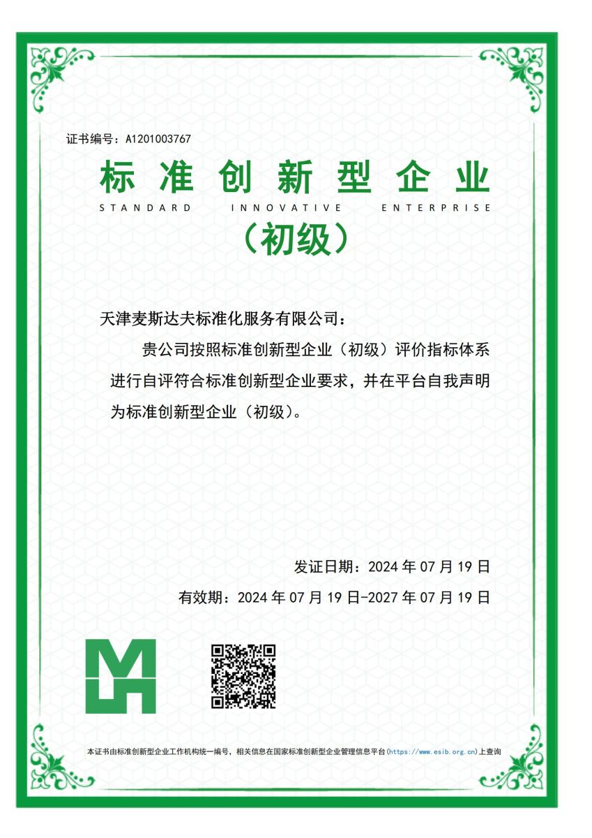 天津麥斯達夫標(biāo)準(zhǔn)化服務(wù)有限公司獲評標(biāo)準(zhǔn)創(chuàng)新型企業(yè)