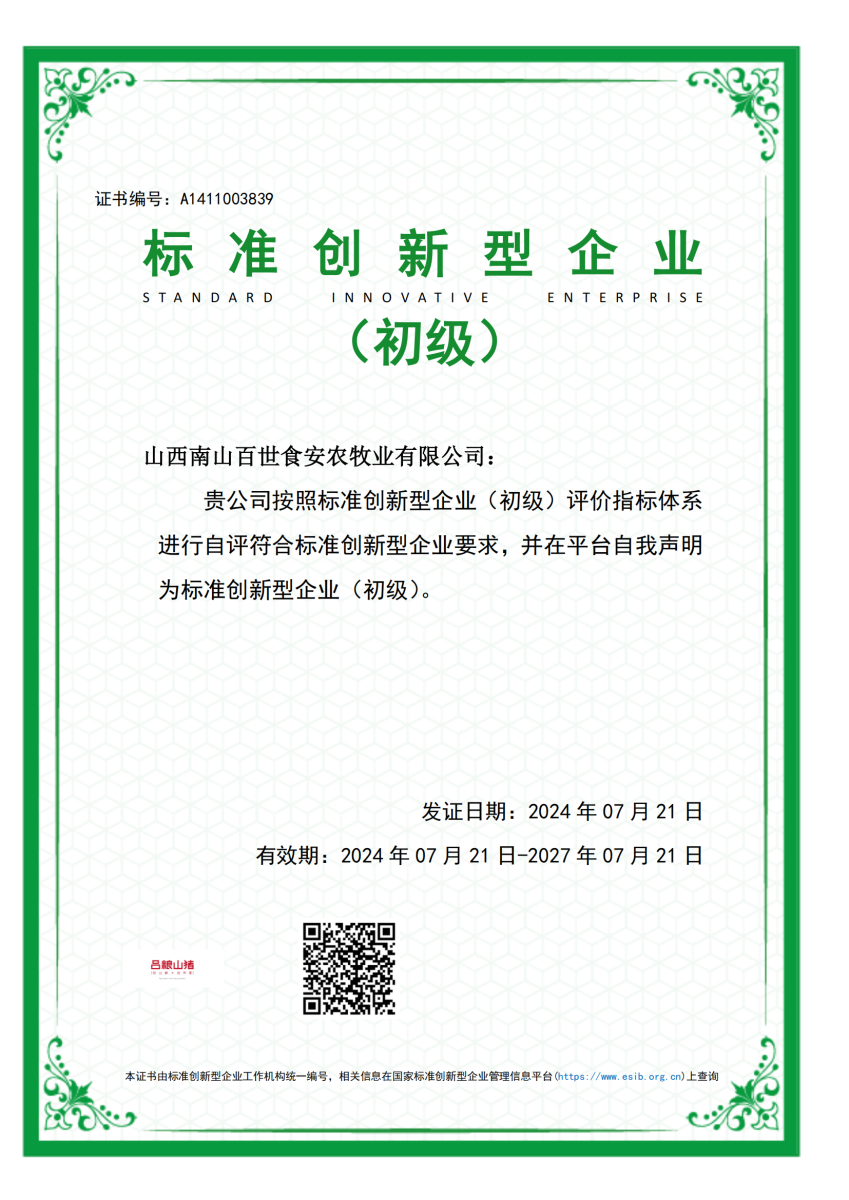 山西南山百世食安農(nóng)牧業(yè)有限公司獲評(píng)標(biāo)準(zhǔn)創(chuàng)新型企業(yè)