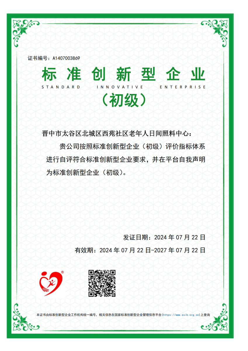 晉中市太谷區(qū)北城區(qū)西苑社區(qū)老年人日間照料中心獲評(píng)標(biāo)準(zhǔn)創(chuàng)新型企業(yè)
