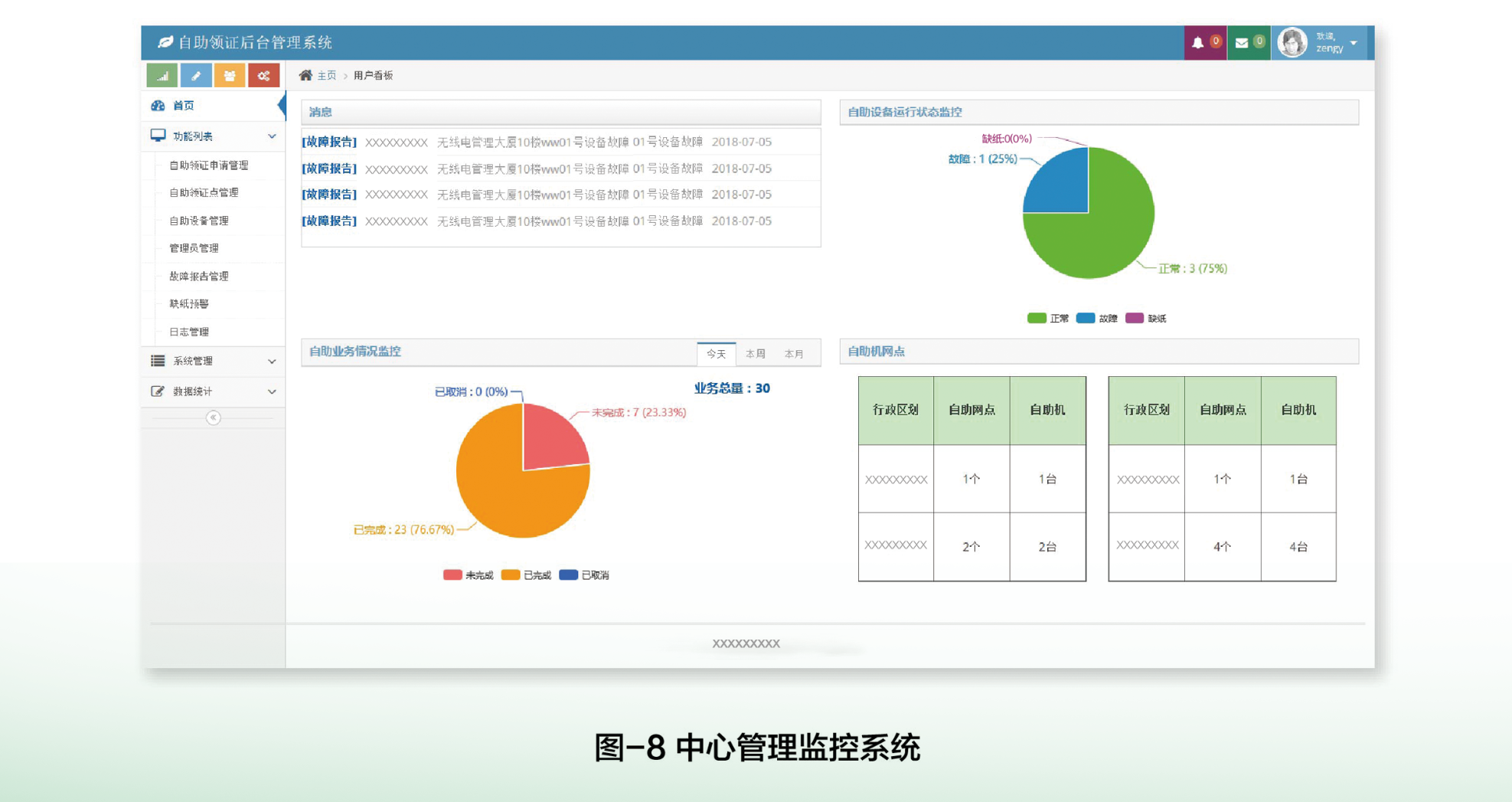 管理和監(jiān)控系統(tǒng)提供給運(yùn)營人員使用,通過該系統(tǒng)對(duì)分布在各個(gè)政務(wù)大廳的自助打印機(jī)進(jìn)行統(tǒng)一管理和監(jiān)控。系統(tǒng)及時(shí)處理自助領(lǐng)照申請(qǐng),監(jiān)控各政務(wù)大廳自助機(jī)運(yùn)行狀態(tài),處理自助機(jī)故障處理請(qǐng)求,并對(duì)各打印機(jī)出證量、剩余空白證照做實(shí)時(shí)統(tǒng)計(jì)和預(yù)警,為自助打印機(jī)的正常運(yùn)行提供保障與支持。