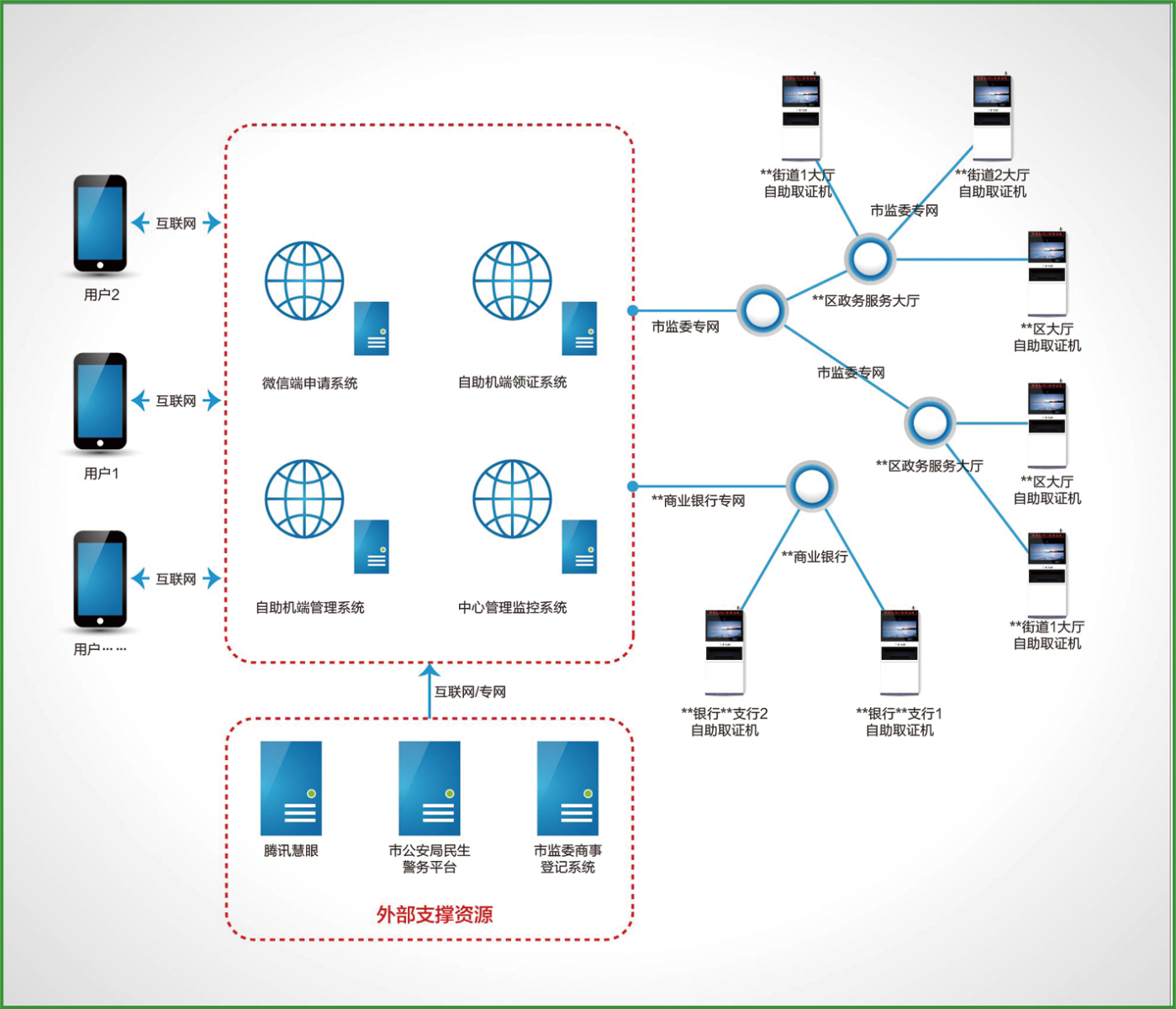 自助機(jī)系統(tǒng)采用中央服務(wù)器部署模式,所有的軟件系統(tǒng)和數(shù)據(jù)庫都部署在中心機(jī)房,各政務(wù)大廳或商業(yè)銀行的自助機(jī)終端通過市場(chǎng)監(jiān)管委專網(wǎng)或銀行專線鏈路訪問中心服務(wù)器,自助設(shè)備訪問服務(wù)器都須通過安全準(zhǔn)入控制。該部署方式一方面保障了系統(tǒng)和數(shù)據(jù)的安全性,自助機(jī)設(shè)備本身不保存任何數(shù)據(jù)和軟件系統(tǒng);另一方面減少終端的維護(hù),所有的軟件和數(shù)據(jù)維護(hù)都在中心服務(wù)器,有專業(yè)的技術(shù)人員保證,終端設(shè)備只需做日常的耗材維護(hù)。
