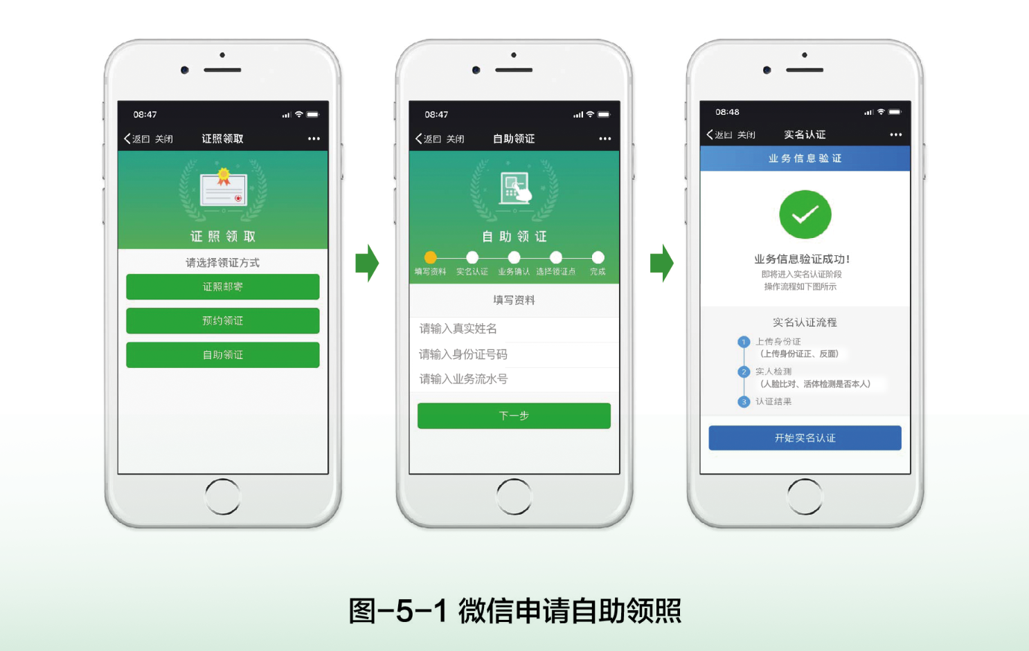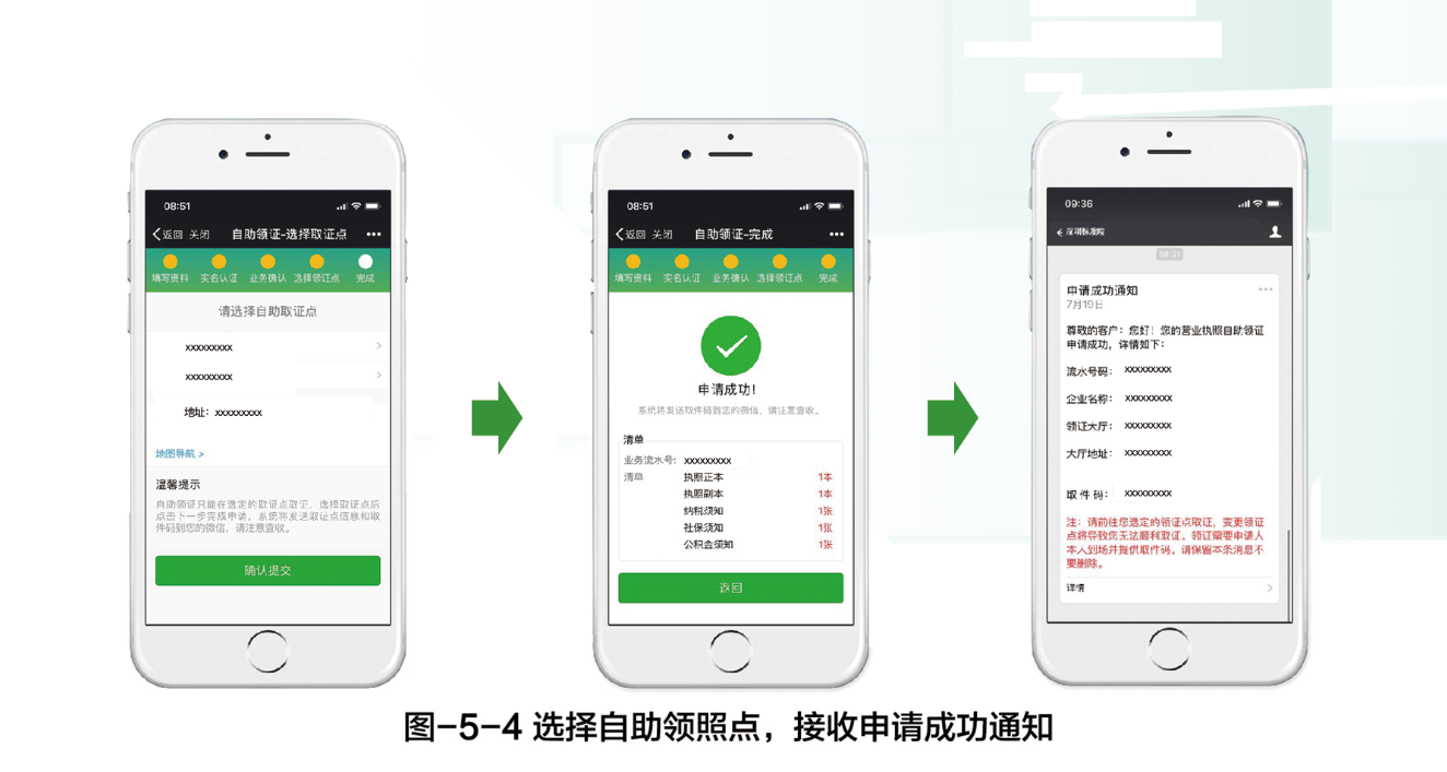 有權(quán)領(lǐng)照人通過微信端申請(qǐng)系統(tǒng)完成自助領(lǐng)照申請(qǐng),系統(tǒng)界面如圖-5-1至圖-5-4所示。申請(qǐng)時(shí)需在系統(tǒng)中完成業(yè)務(wù)信息驗(yàn)證、實(shí)名認(rèn)證、照面信息確認(rèn)和自助領(lǐng)照點(diǎn)的選擇,申請(qǐng)?zhí)峤怀晒?,系統(tǒng)將通過微信消息將自助領(lǐng)照點(diǎn)地址和取證碼等信息發(fā)送給申請(qǐng)人。