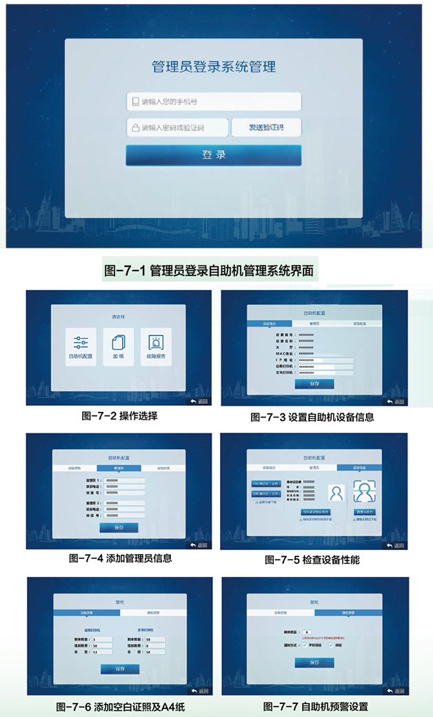 每臺(tái)自助領(lǐng)照機(jī)需要大廳配備至少—名管理人員,管理員通過個(gè)人微信登錄自助機(jī)管理系統(tǒng)完成自助機(jī)的日常管理和維護(hù)工作。自助機(jī)管理系統(tǒng)主要提供自助機(jī)網(wǎng)絡(luò)安全配置、日常空白證照和紙張管理、缺紙預(yù)警提醒、設(shè)備故障檢測(cè)等功能,設(shè)備故障時(shí)可通過該系統(tǒng)發(fā)送故障報(bào)告,求助中心技術(shù)人員維修處理,系統(tǒng)界面如圖-7-1至圖-7-7所示。