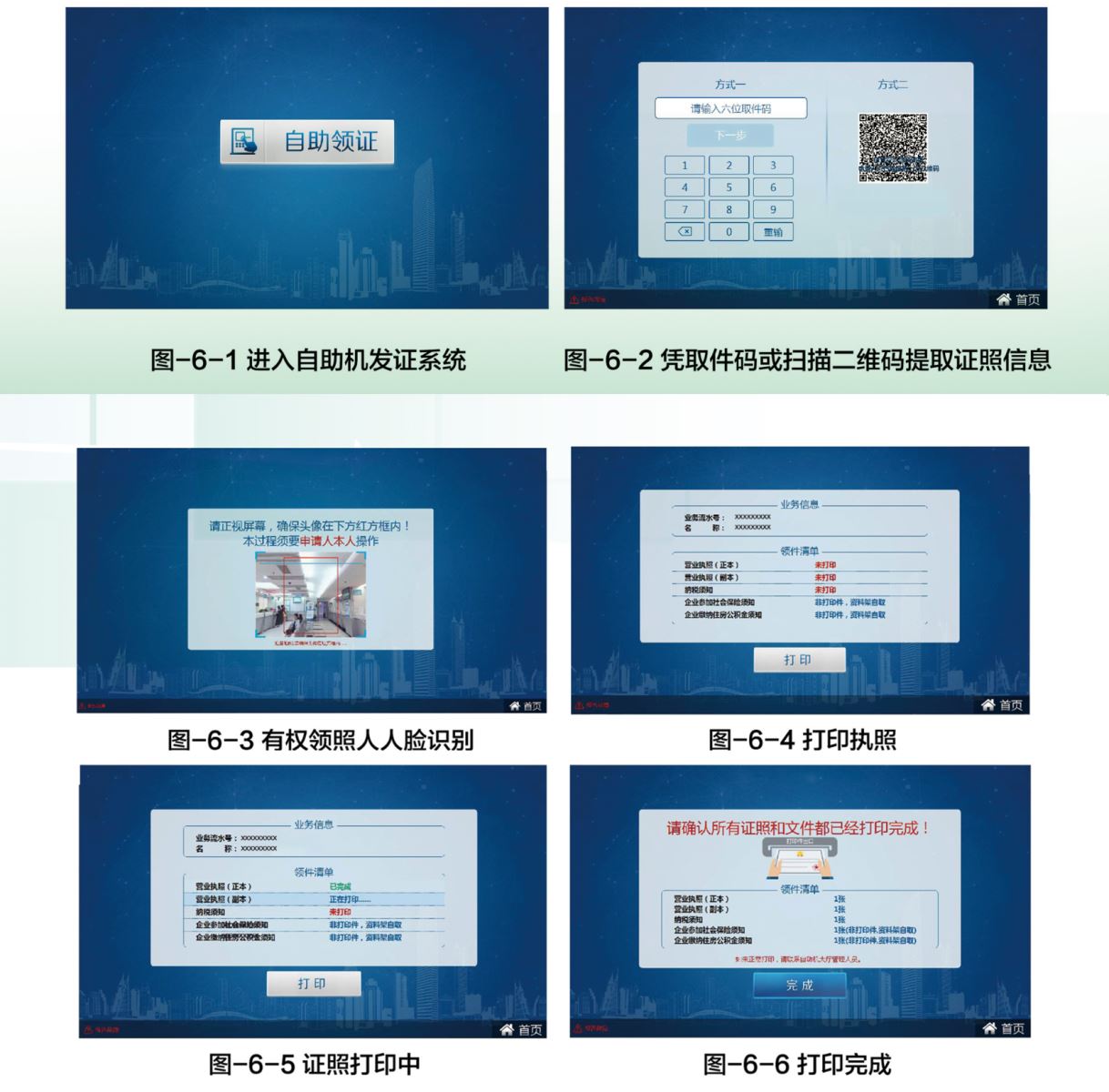 申請(qǐng)人通過自助機(jī)領(lǐng)照系統(tǒng)完成領(lǐng)照,系統(tǒng)界面如圖-6-1至圖-6-6所示。成功申請(qǐng)自助領(lǐng)照的申請(qǐng)人到達(dá)選定的自助領(lǐng)照點(diǎn),輸入正確的取件碼或通過微信掃描自助機(jī)屏幕二維碼,通過人臉識(shí)別驗(yàn)證,即可調(diào)取相應(yīng)業(yè)務(wù)信息及待打印的證件清單,點(diǎn)擊打印按鈕開始自助打證。